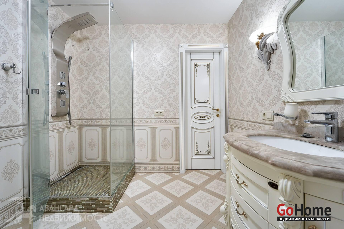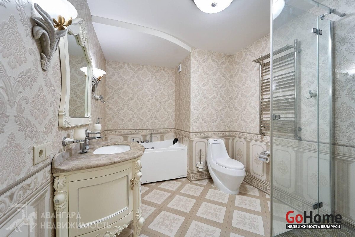 - Джакузи + душевая кабина, поверхность умывальника изготовлена из мрамора.