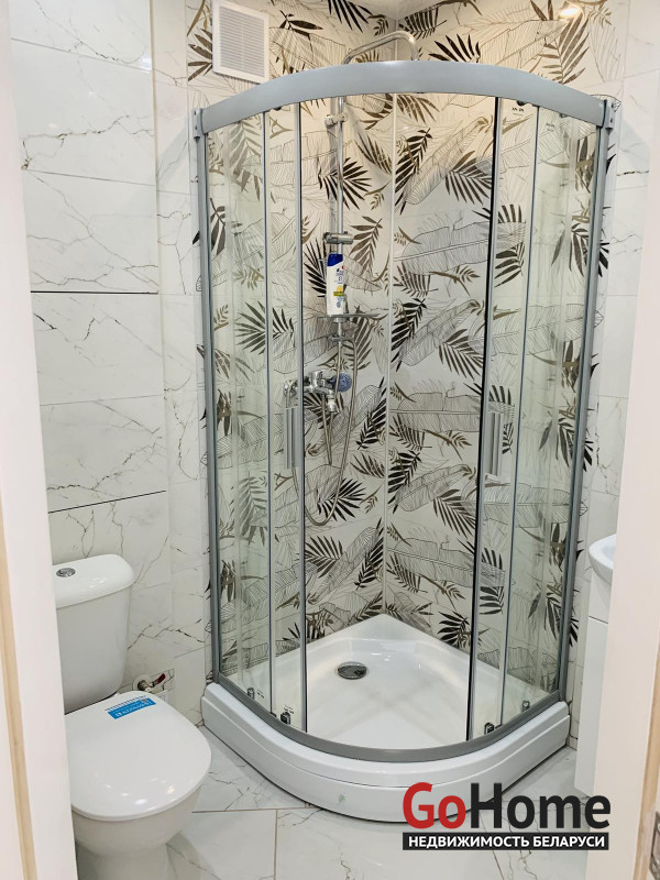 — Чистый санузел с душевой кабиной и стиральной машиной.