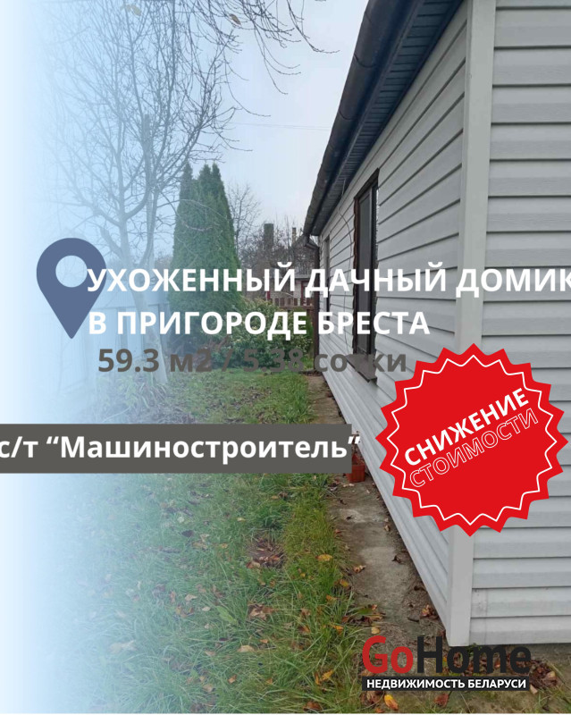 Подписывайтесь на наш instagram @ecrzby для удобного слежения за новыми актуальными объектами.Продаётся дачный участок с домиком в СТ "Машиностроитель" (Чернавчицкий с/с). Площадь участка составляет 5.38 соток Площадь дома - 59.3 м2 , 2015 г.п. Дачный участок находится всего в 1.5 км от Бреста в направлении города Каменец, в 500 метрах расположена остановка районного сообщения. В окрестностях есть лес и река Лесная, что делает это место идеальным для отдыха на природе. Участок огорожен забором со всех сторон, на нём есть уличный туалет, дровница и залит фундамент для постройки бани с выведенными трубами для воды и канализации. Дом построен из блоков, крыша двухскатная, покрыта металлочерепицей, стены утеплены и обшиты сайдингом. Внутри находятся три жилые комнаты, оборудованная кухня и ванная комната, совмещённая с санузлом. Коммуникации включают газ на участке, печное отопление, скважину и гидрофор для водоснабжения.
