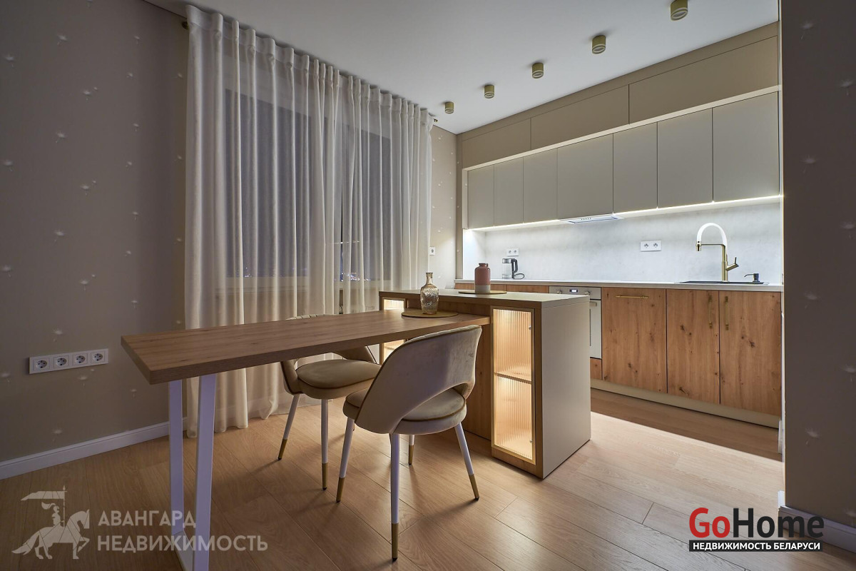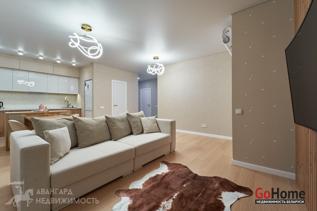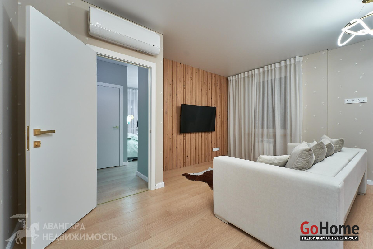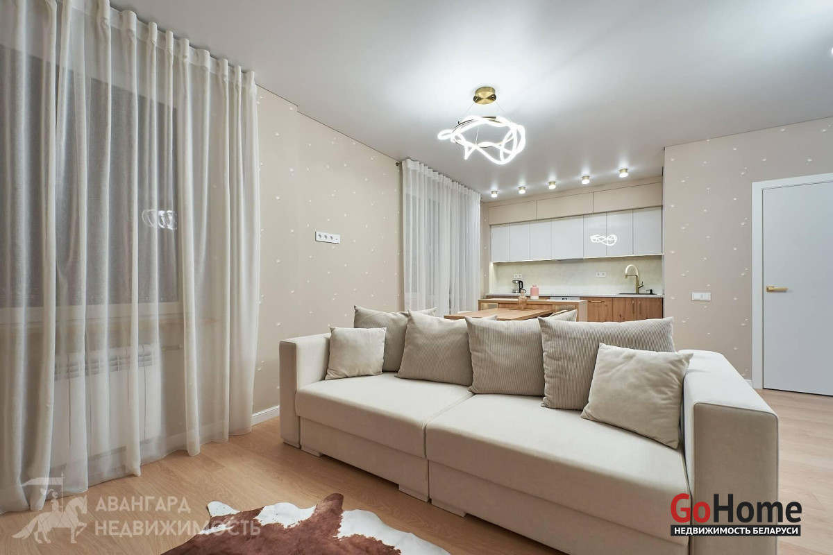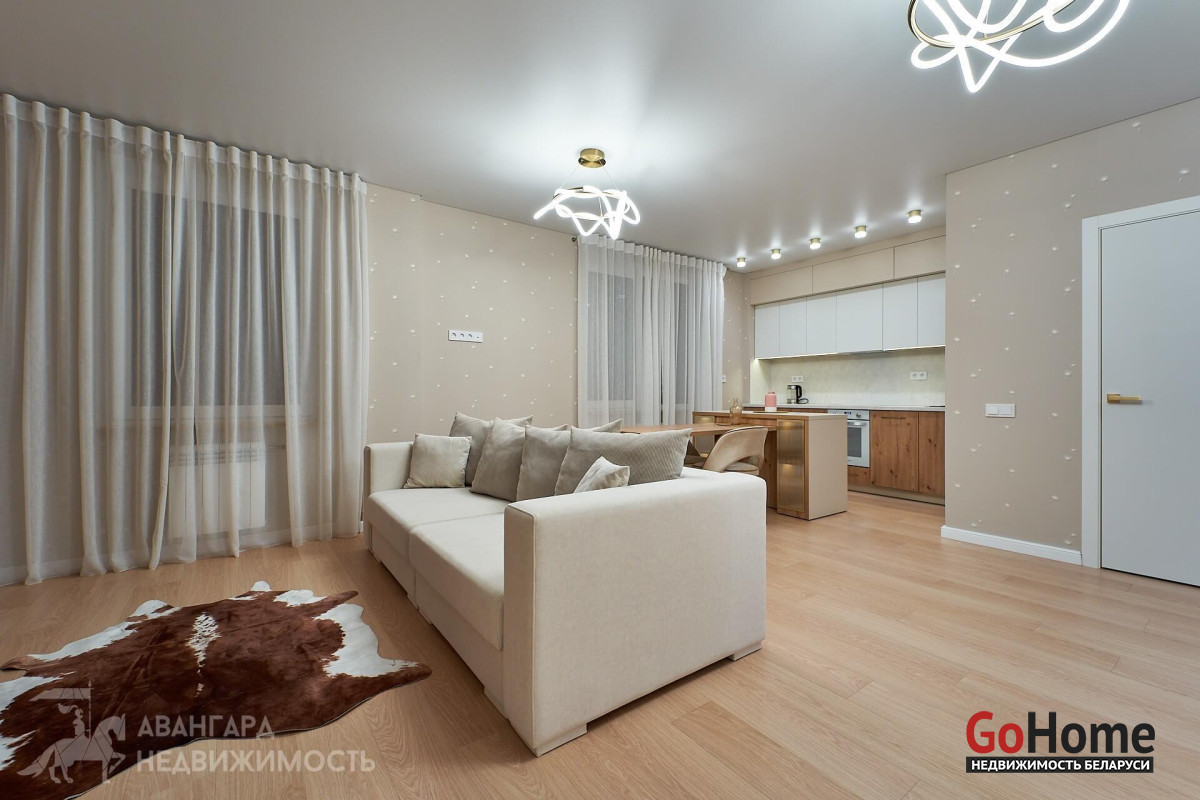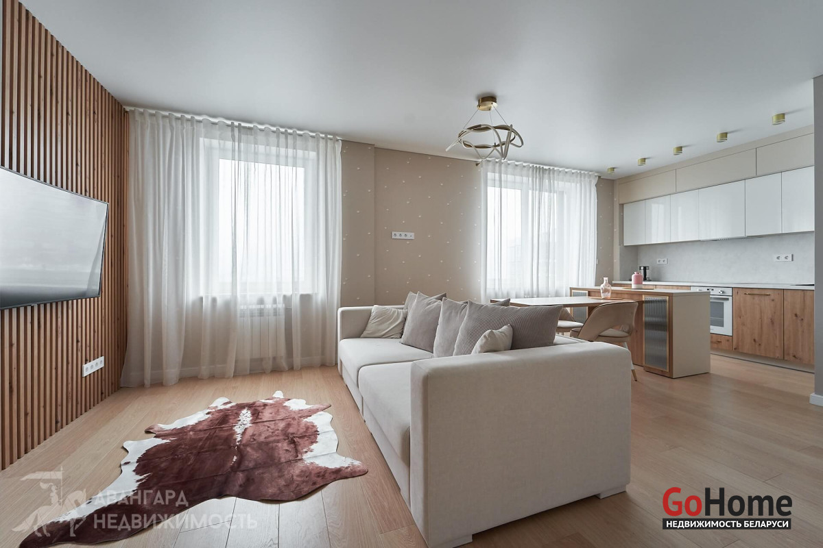 Просторная атмосферная абсолютно новая евродвухкомнатная квартира с потрясающими видами на Минск с высоты 22 этажа в ЖК D3, выполнена по дизайн-проекту в экостиле в спокойных теплых тонах с применением исключительно высококачественных материалов, техникой и мебелью премиум класса из Европы.