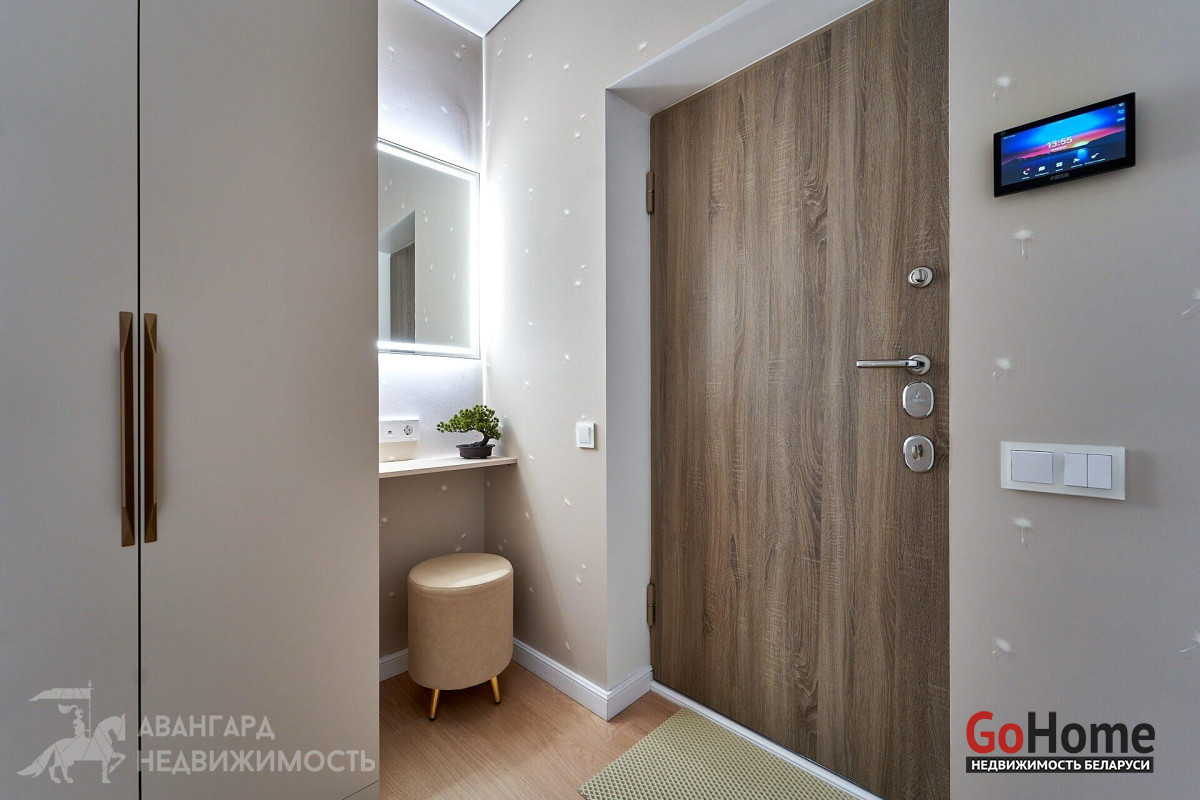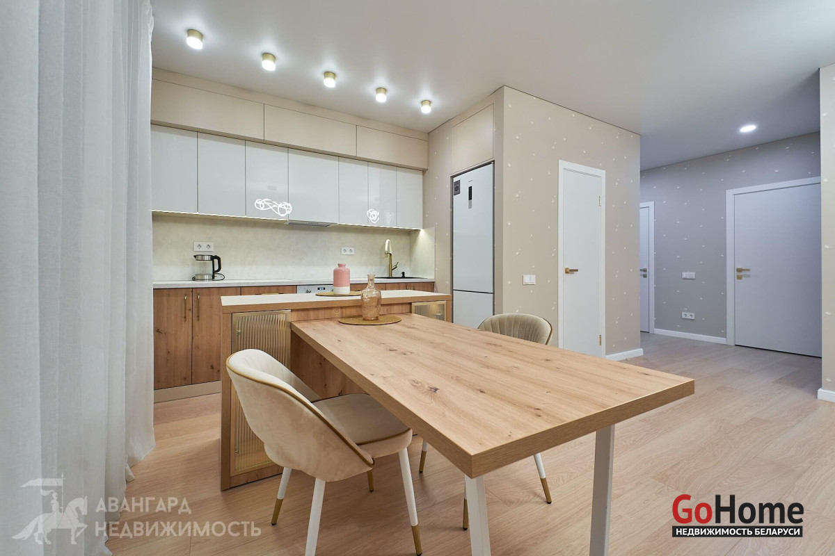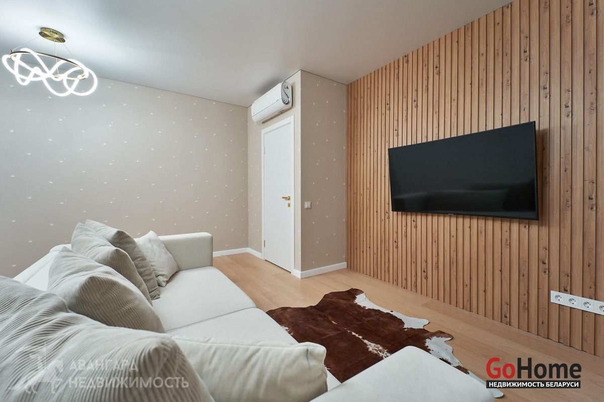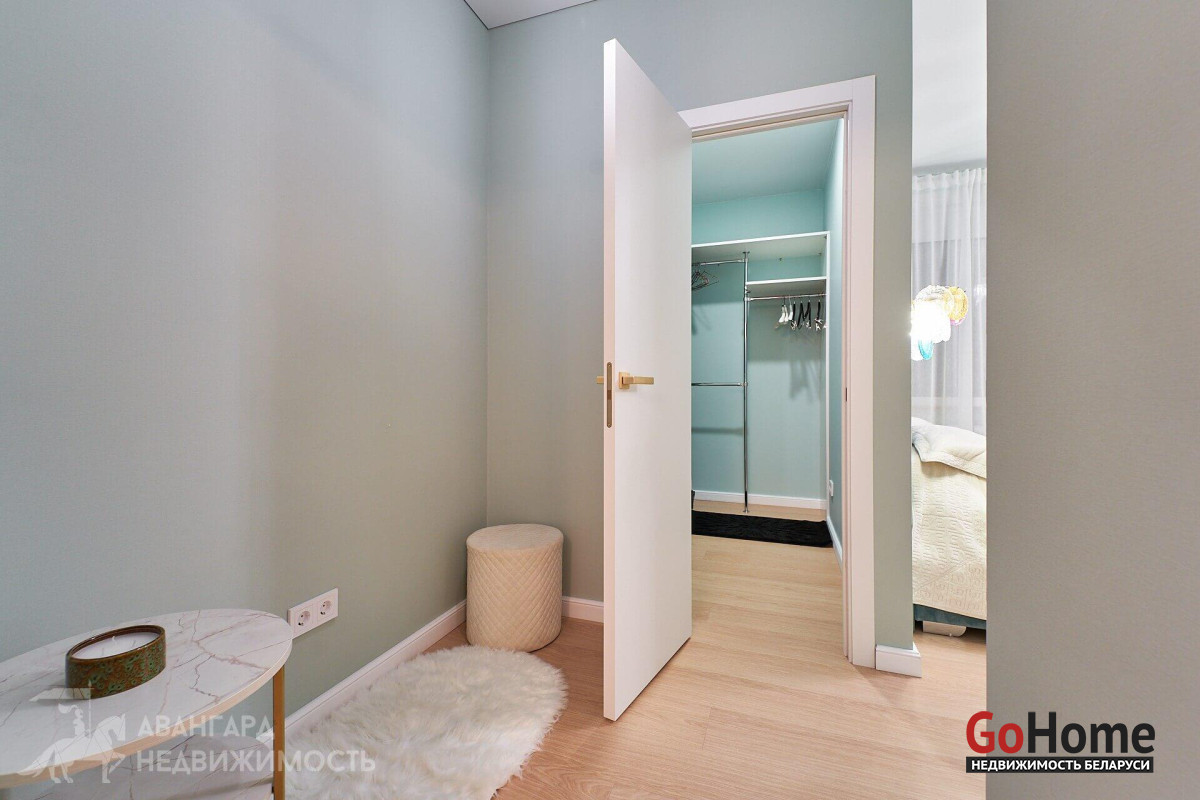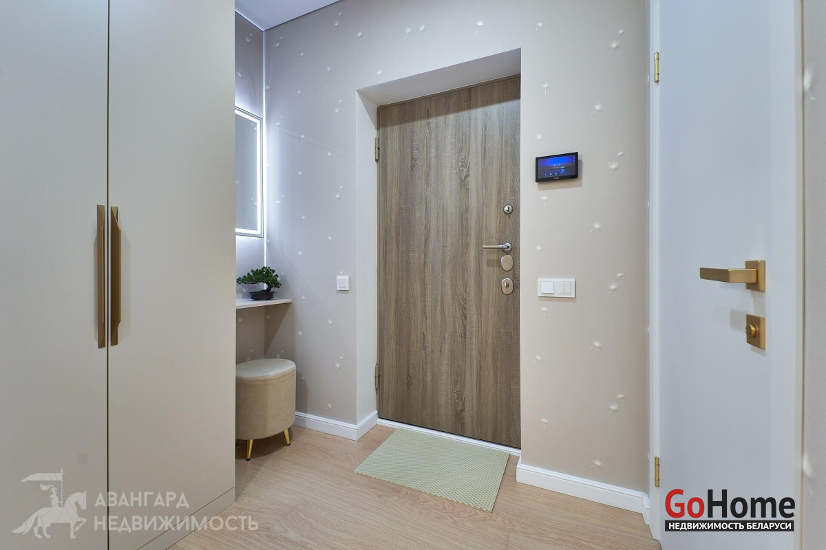 Просторная атмосферная абсолютно новая евродвухкомнатная квартира с потрясающими видами на Минск с высоты 22 этажа в ЖК D3, выполнена по дизайн-проекту в экостиле в спокойных теплых тонах с применением исключительно высококачественных материалов, техникой и мебелью премиум класса из Европы.
