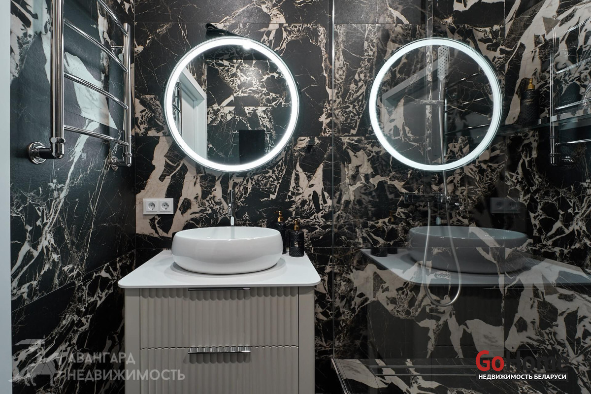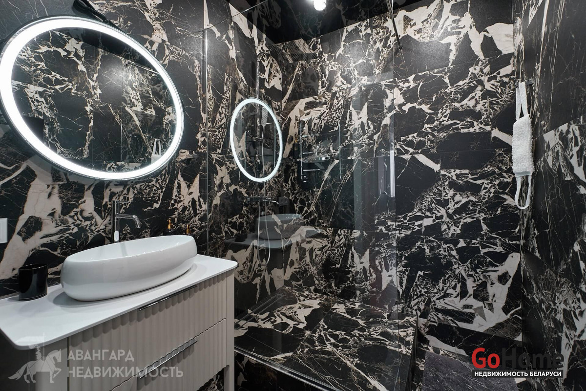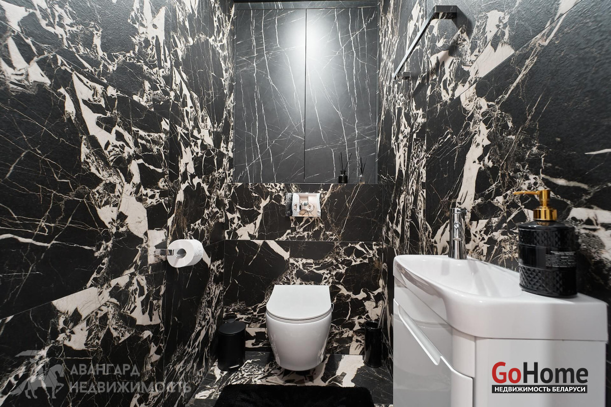 В туалете и ванной уложен итальянский керамогранит с имитацией натуральной поверхности камня, установлена мебель и сантехника европейских производителей премиального уровня.