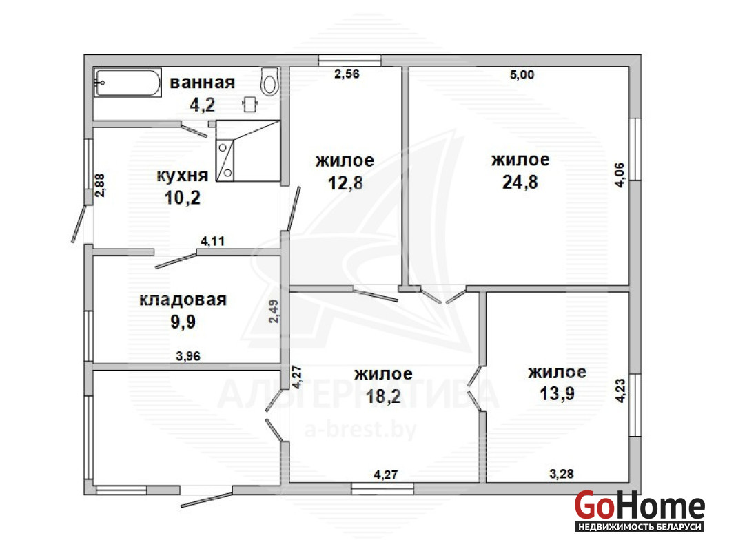 Жилой дом в Брестском р-не. 1980 г.п. 1 этаж. Общ.СНБ - 104,9 кв.м, общ.- 94,6 кв.м, жил.- 69,7 кв.м, кух.- 10,2 кв.м. 4 комнаты, высота потолка - 2,70 м.
