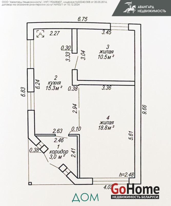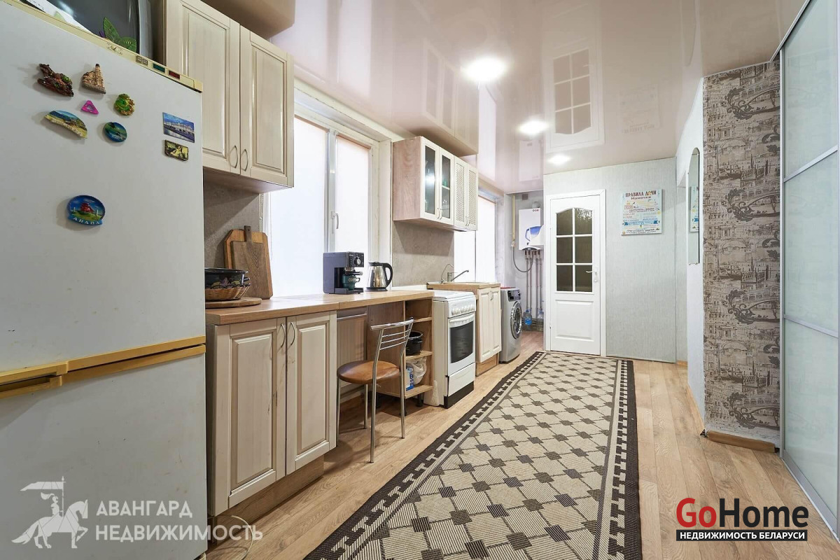 Общая площадь дома 47,6 м2. При входе небольшой коридор 3,0 м2, две изолированные жилые комнаты 18,8 м2 и 10,5 м2, в них уже есть необходимая мебель и техника. В кухне 15,3 м2 вы также найдете кухонный гарнитур, холодильник, газовую плиту и стиральную машину. Санузел с душевой кабиной. По всему дому установлены стеклопакеты, на полу лежит линолеум.