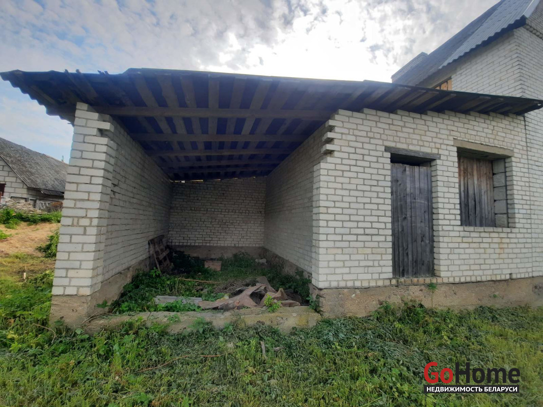 Кирпичный гараж пристроен к дому, есть летняя кухня, фундамент под веранду.