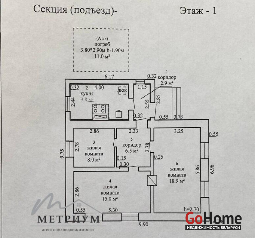 Дом с современной планировкой: 3 изолированные комнаты - 18,9м2, 15,0м2, 8,0м2. Кухня 9,8м2. Есть погреб. Дом под ремонт.