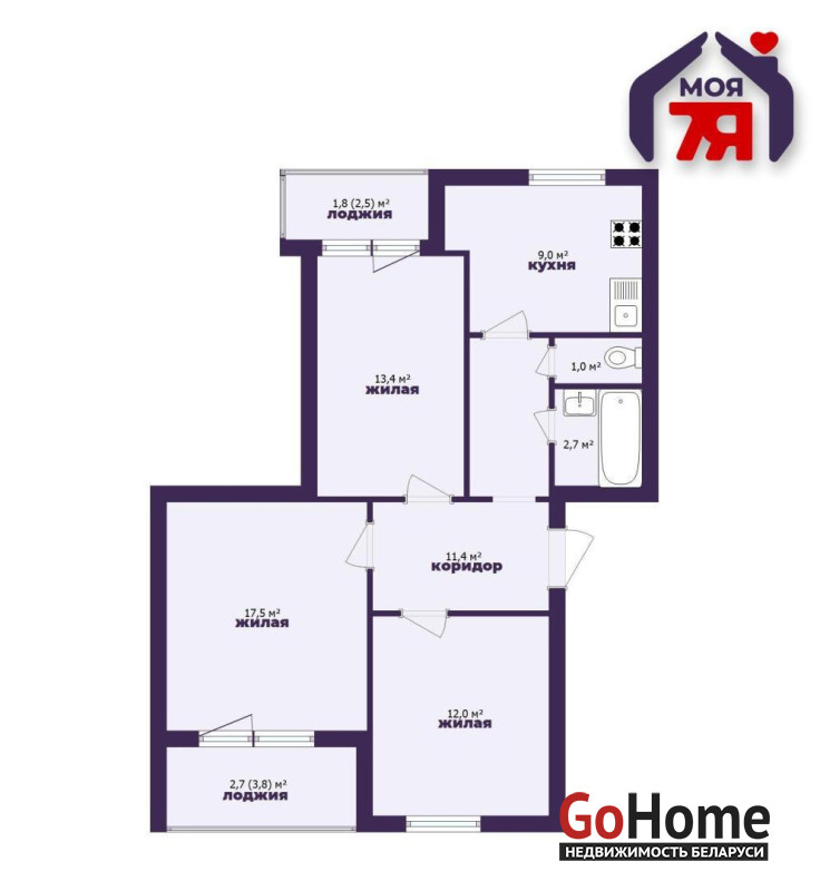 -Общая площадь - 71,5 кв.м., жилая - 42,9 кв.м.