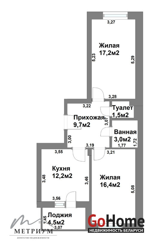 Комнаты 17,2м2 и 16,4м2 расположены на две стороны, большая кухня 12,2м2, раздельный санузел, застекленная лоджия.