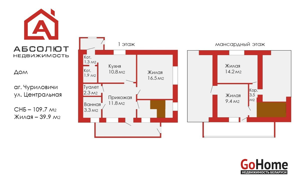 Общая площадь – 109.7 кв.м, жилая площадь – 39.9 кв.м., кухня – 10.8 кв.м.