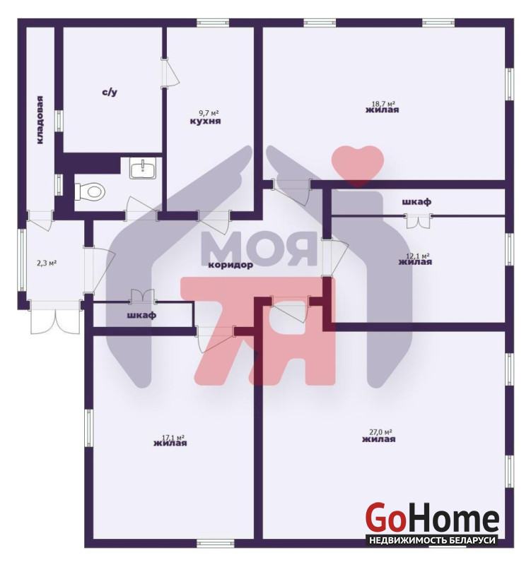 - Продуманная планировка, выполнено грамотное зонирование. В доме 4 изолированные комнаты (27кв.м., 18,7 кв.м., 17,1 кв.м. и 12,1 кв.м.), комфортная кухня площадью 9,7м2 и вместительная кладовая.