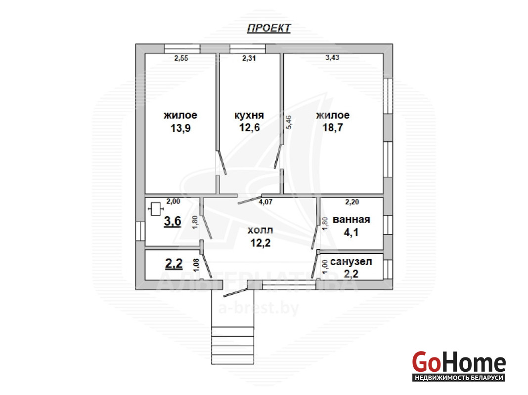 Жилой дом в Жабинковском р-не. 1 этаж. Общ.СНБ - 43,5 кв.м, общ.- 43,5 кв.м, жил.- 18,4 кв.м, 2 комнаты, высота потолка - 2,6 м.