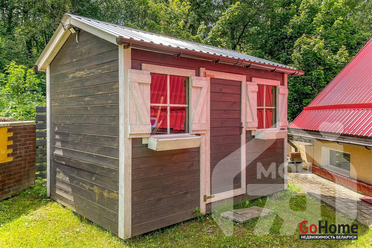 -На участке всё продумано до мелочей: есть хозпостройка для хранения инвентаря, аккуратные дорожки, выделенное парковочное место и даже большой запас дров.