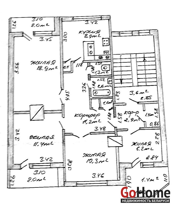 Общая площадь 78,5 м.кв., жилая 46,8 м.кв., кухни 8.9 м.кв. Дом расположен на земельном участке 0,1574 га (ПНВ). Вода и канализация центральные. За квартирой закреплено подвальное помещение. Первый этаже отапливается от электрического котла. На втором этаже - отопление печное. К дому проведено оптоволокно для высокоскоростного интернета. На участке имеются хоз. постройки, плодово- ягодные деревья и кустарники. Квартира требует полного ремонта.