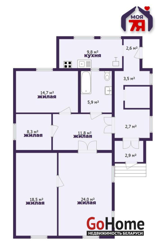 - Общая площадь дома составляет 95,6 м2. В доме имеется четыре жилые комнаты, одна из них проходная, кухня 9,8 м2, прихожая и совмещенный просторный санузел с ванной.