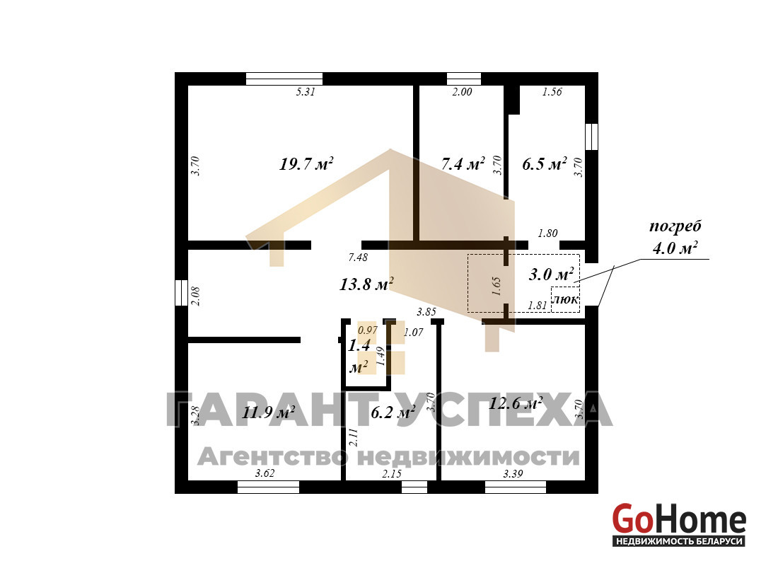 По плану в доме на первом этаже расположены прихожая, топочная, разделенный санузел, кухня и 2 жилые комнаты. Так же в доме есть погреб.