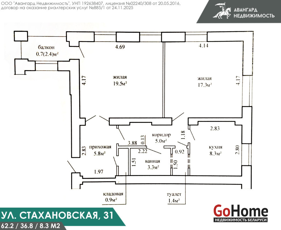 Квартира расположена на комфортном 2-м этаже. Площадь по СНБ 62,2 кв. м., жилые комнаты 19,5 кв. м. и 17,3 кв. м., большая кухня 8,3 кв. м. и высокие потолки.