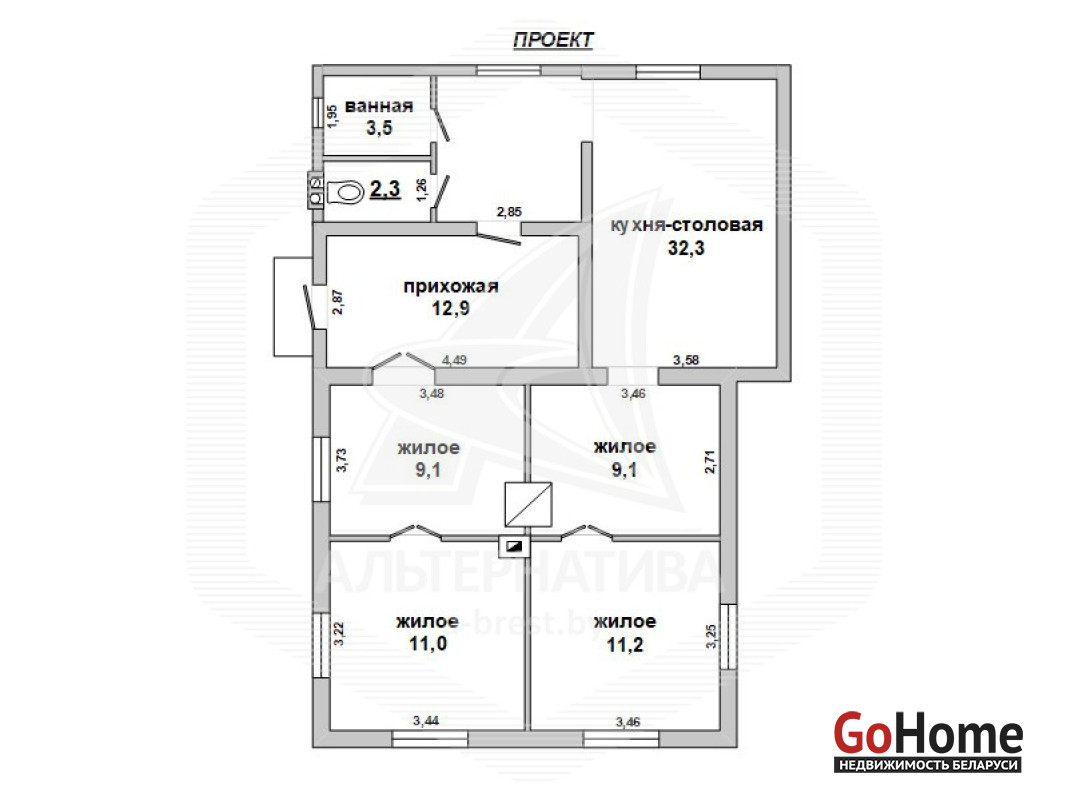 Жилой дом в г.Бресте. 1960 г.п. 1 этаж. Общ.СНБ - 68,6 кв.м, общ.- 68,6 кв.м, жил.- 40,4 кв.м, кух.- 12,2 кв.м. 4 комнаты, высота потолка - 2,8 м.