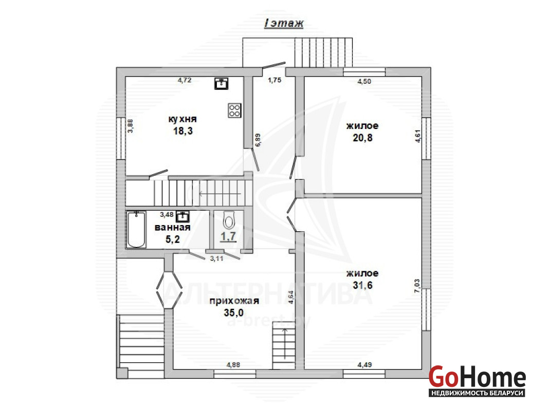 Жилой дом в Брестском р-не. 1996 г.п. 2 этажа, подвальный этаж. Общ.СНБ - 353,9 кв.м, общ.- 253,7 кв.м, жил.- 133,4 кв.м, кух.- 18,3 кв.м. 5 комнат, высота потолка - 2,9 м.