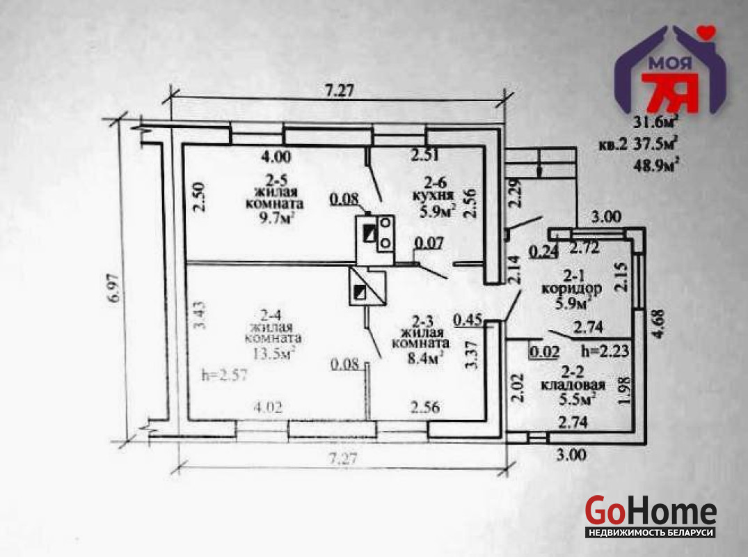 - Общая площадь квартиры составляет 48,9 м2, из которых жилая площадь -31,6 м2, а кухня - 5,9 м2.