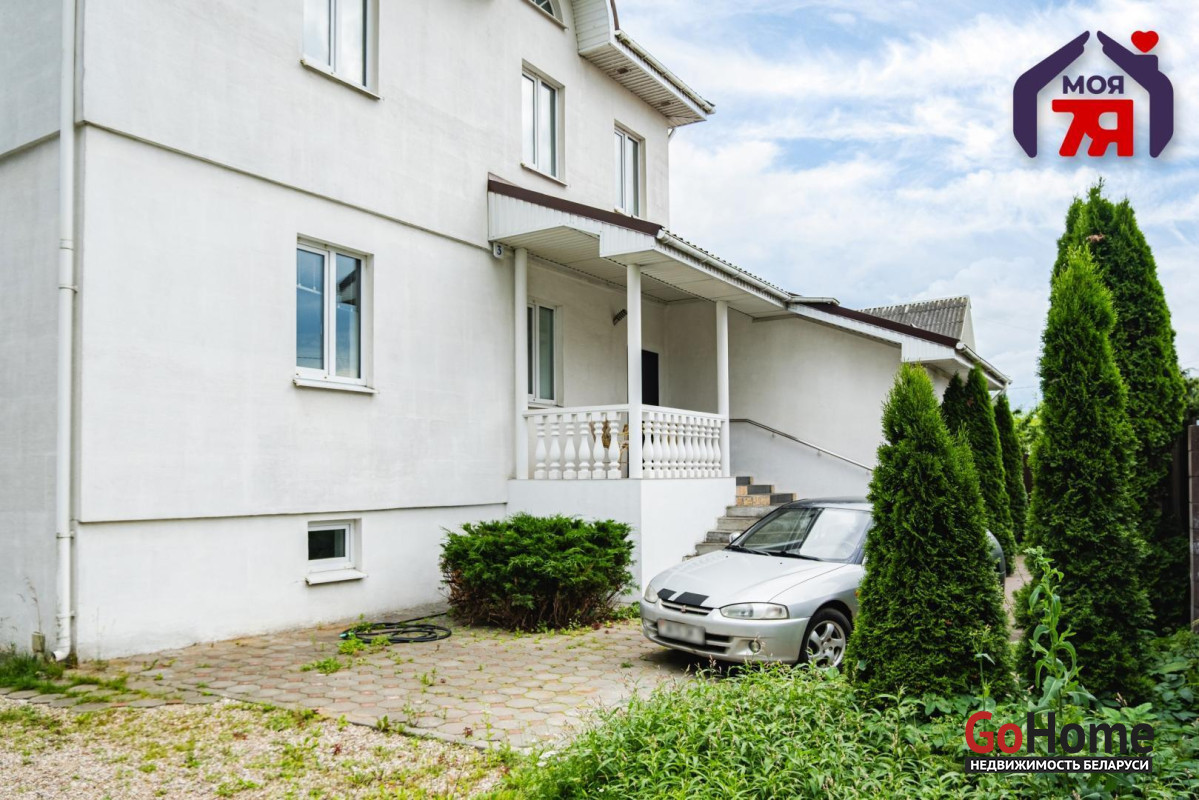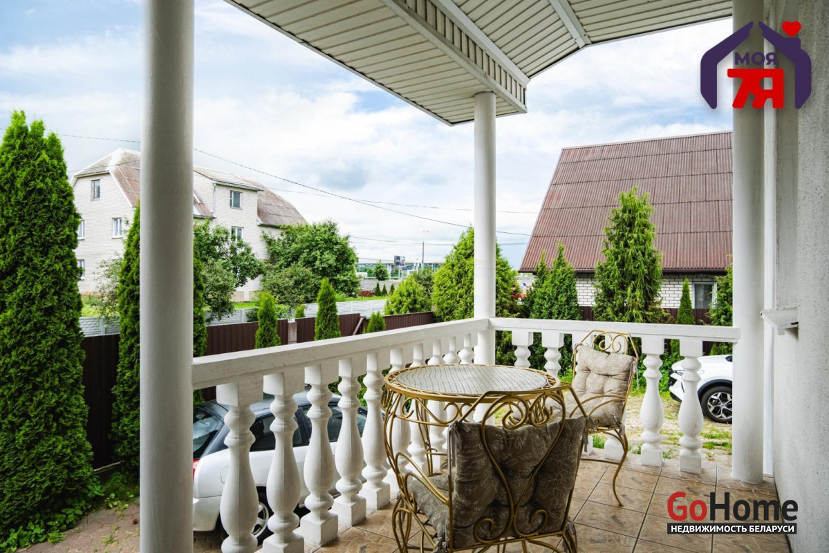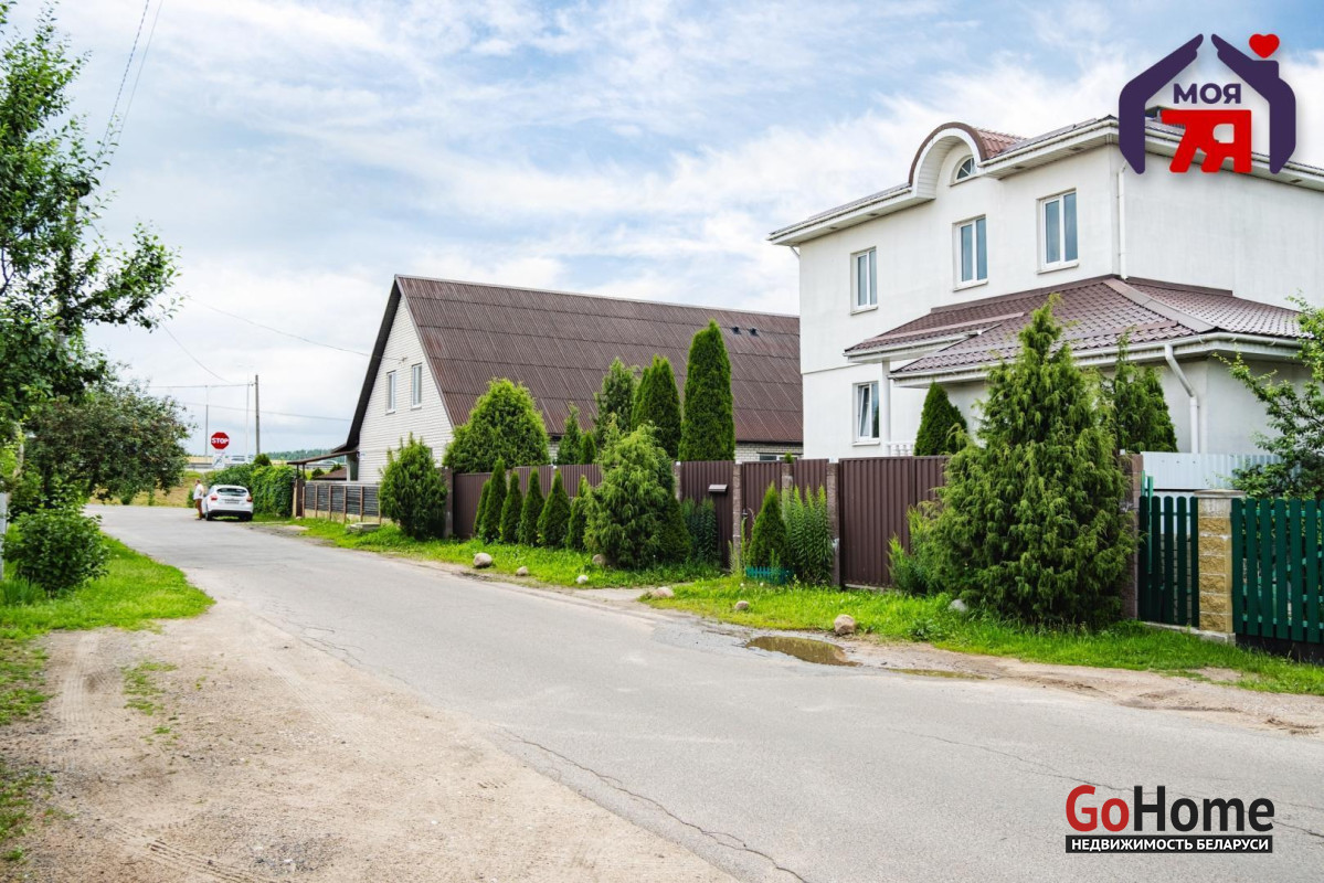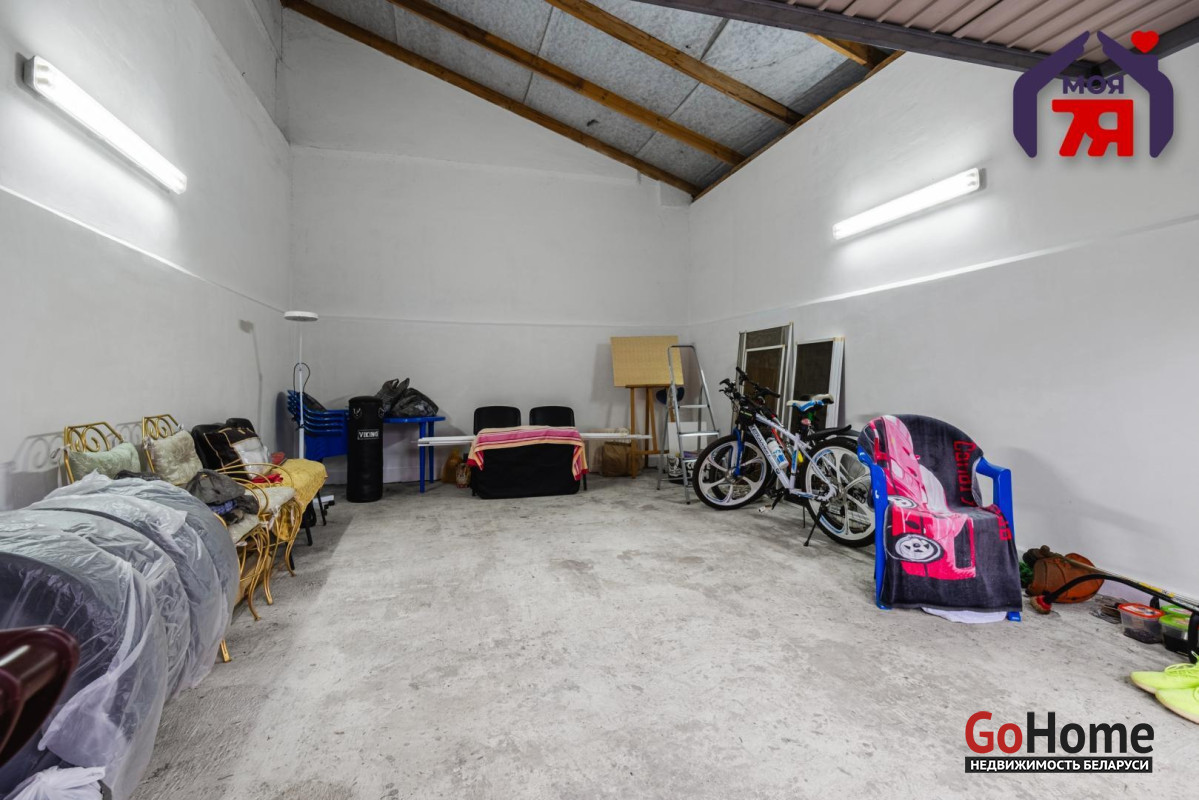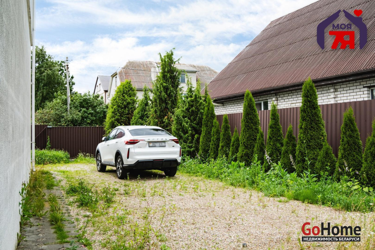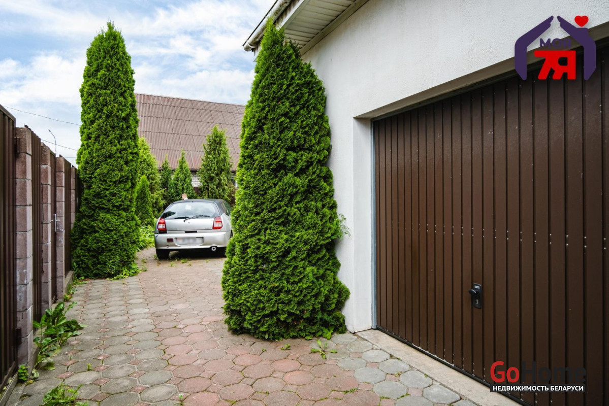 - Снаружи дом имеет металлический забор, откатные ворота и гараж площадью 36 м2, что делает его безопасным и удобным для жизни. Участок облагорожен для отдыха: здесь есть площадка для летней мебели, мангала и насаждения плодовых деревьев - слив, туй и сосен.