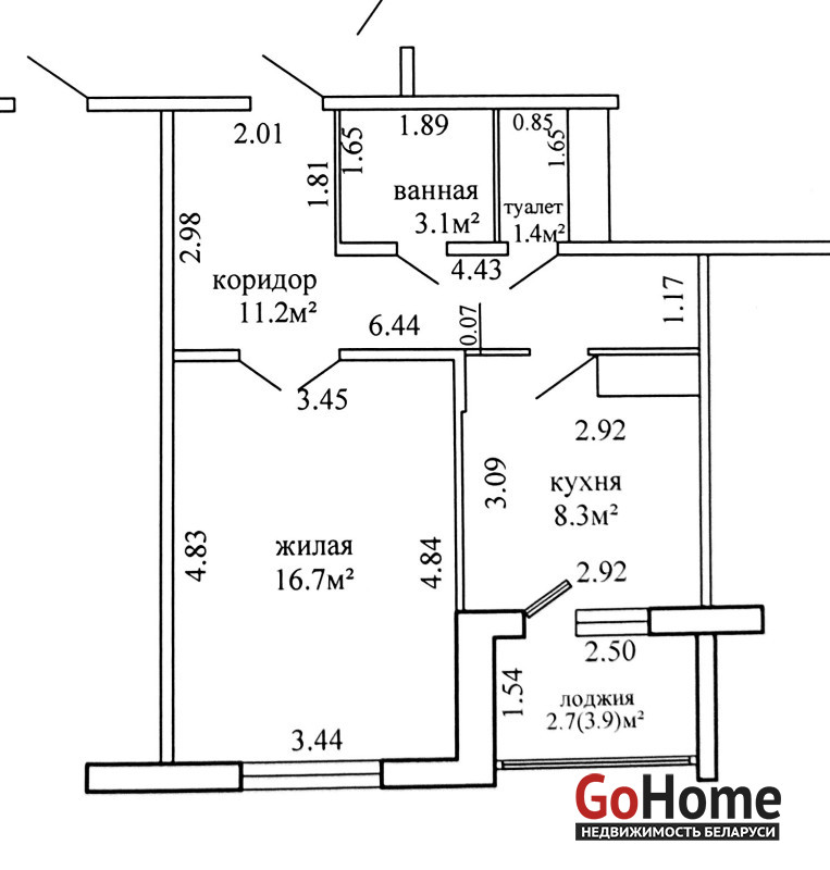 Общая площадь квартиры по СНБ 43,4 м2, жилая 16,7м2, кухня 8,3м2.