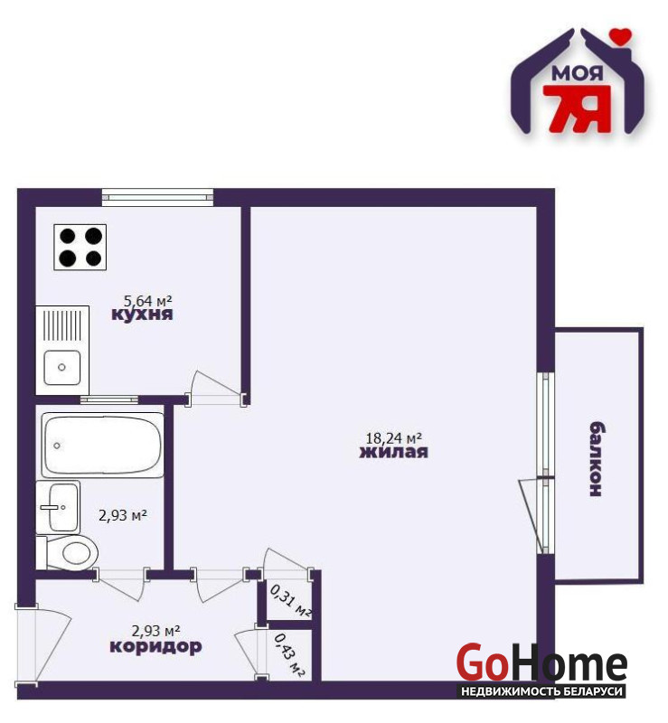 - Квартира светлая, с продуманной планировкой: просторная жилая комната площадью 18,24 м2, аккуратная кухня 5,64 м2, где легко разместится все необходимое, а также совмещенный санузел и удобный коридор с нишей под шкаф или систему хранения. Из комнаты есть выход на балкон, где можно обустроить уютное место для отдыха или мини-зимний сад.