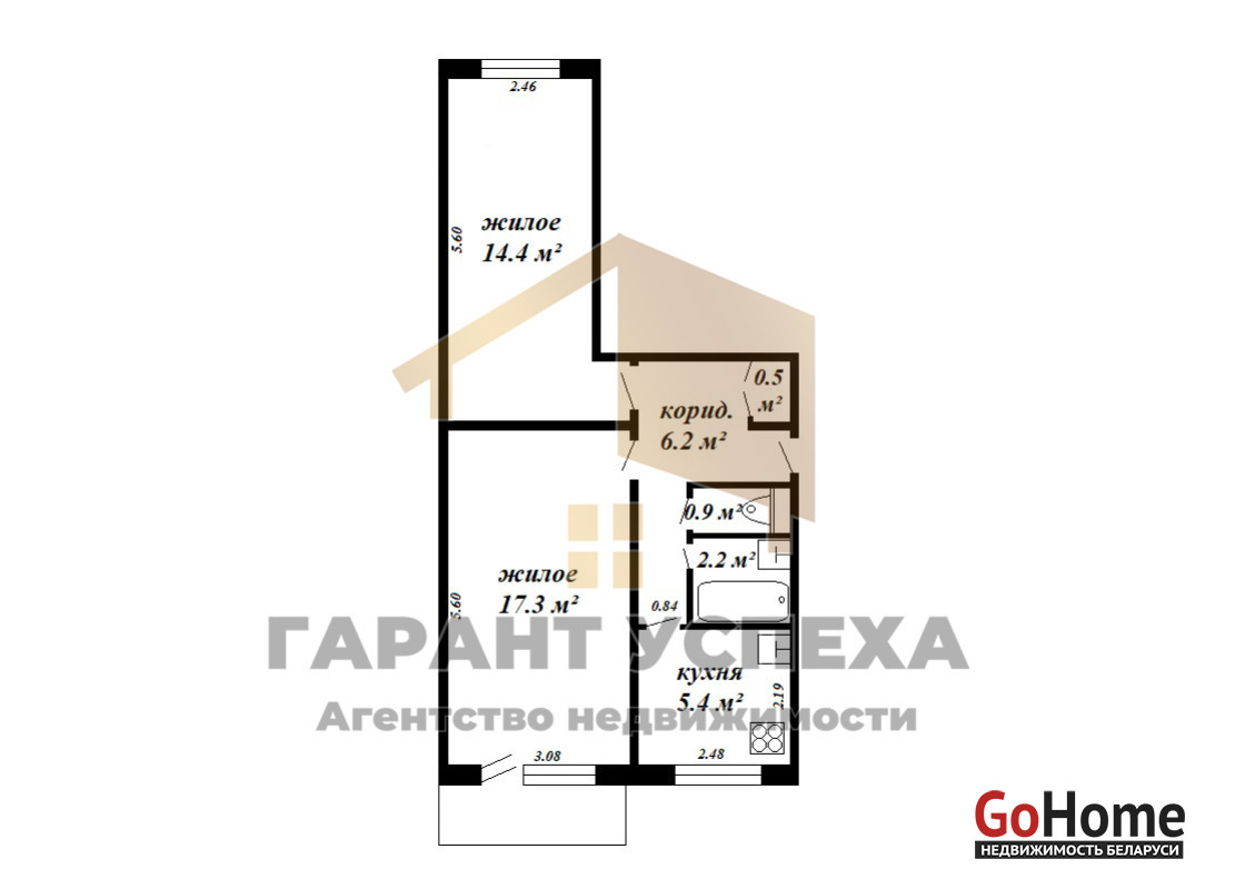 Удобная планировка: две жилые комнаты (17.3 м² и 14.4 м²), раздельный санузел. В квартире имеется застеклённый балкон с выходом из зала.