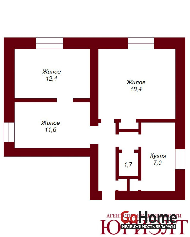 Общая площадь - 59 кв.м., жилая - 42,4 кв.м., кухня - 7,0 кв.м.