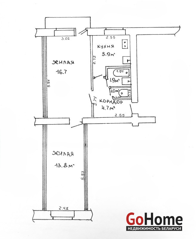 Общая площадь – 44 м², жилая – 30,5 м², кухня – 5.9 м².