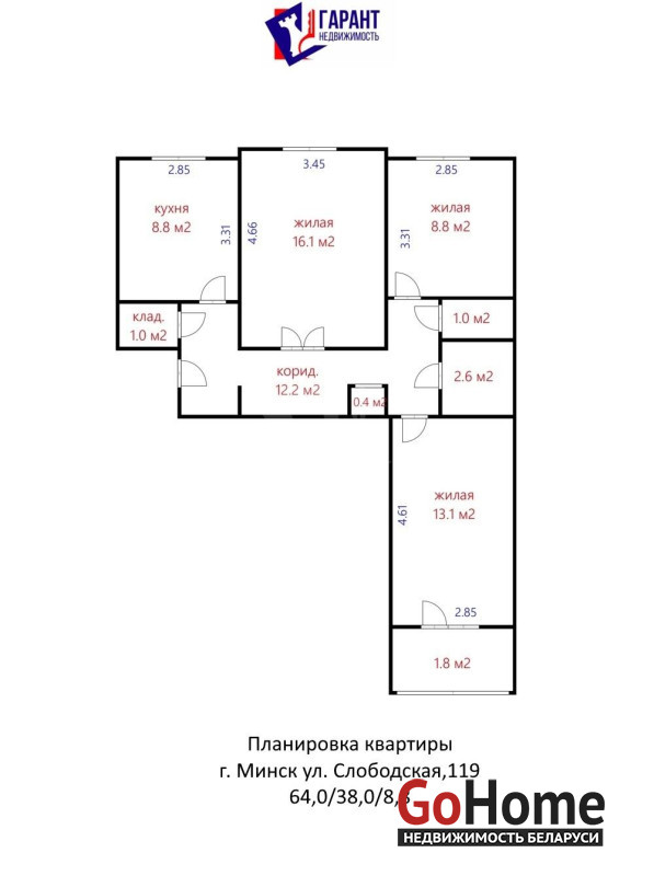 Удобная планировка: просторная кухня 8,8 м и раздельные 3 комнаты.