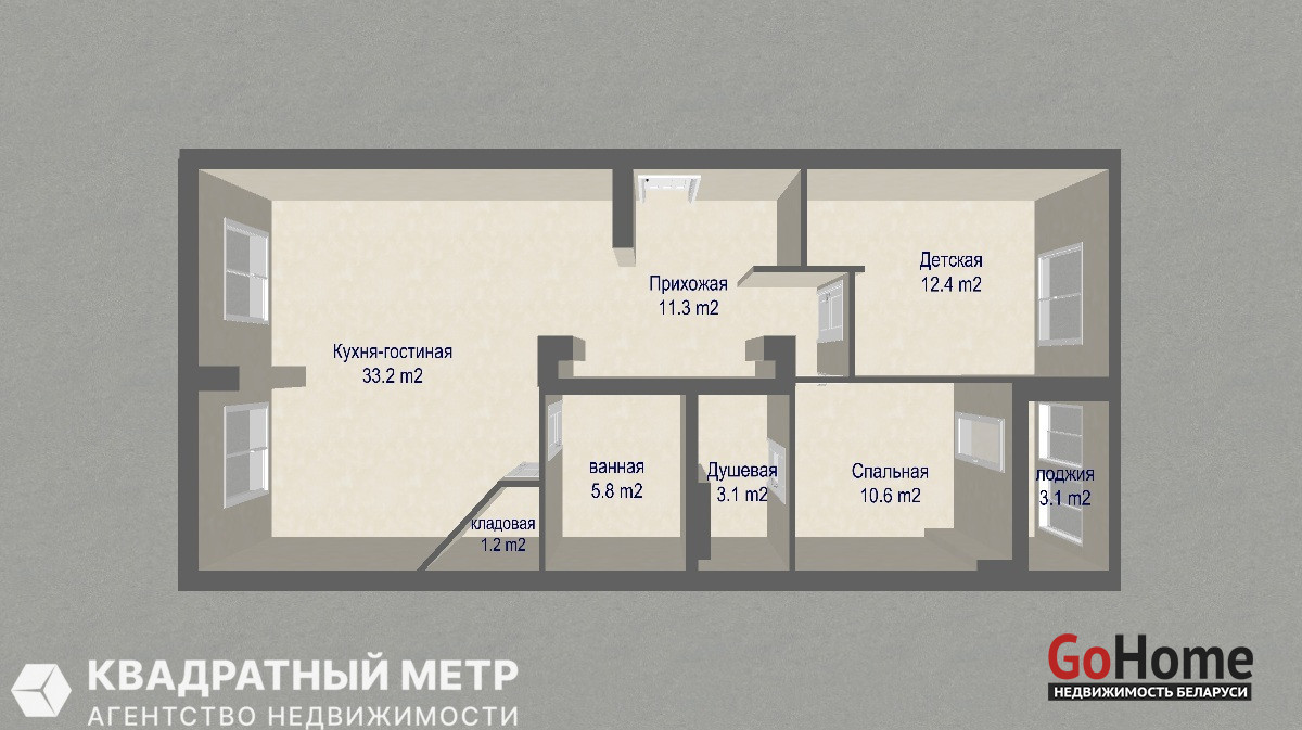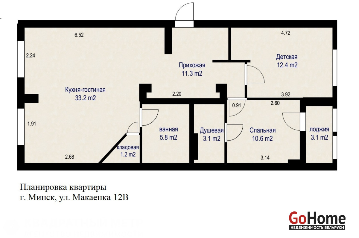1. Отличная планировка: общая площадь по СНБ – 77,4 м2, жилая площадь – 56,4 м2, два санузла 2,7 и 5,2 м2, застекленная лоджия - 3,1 м2.