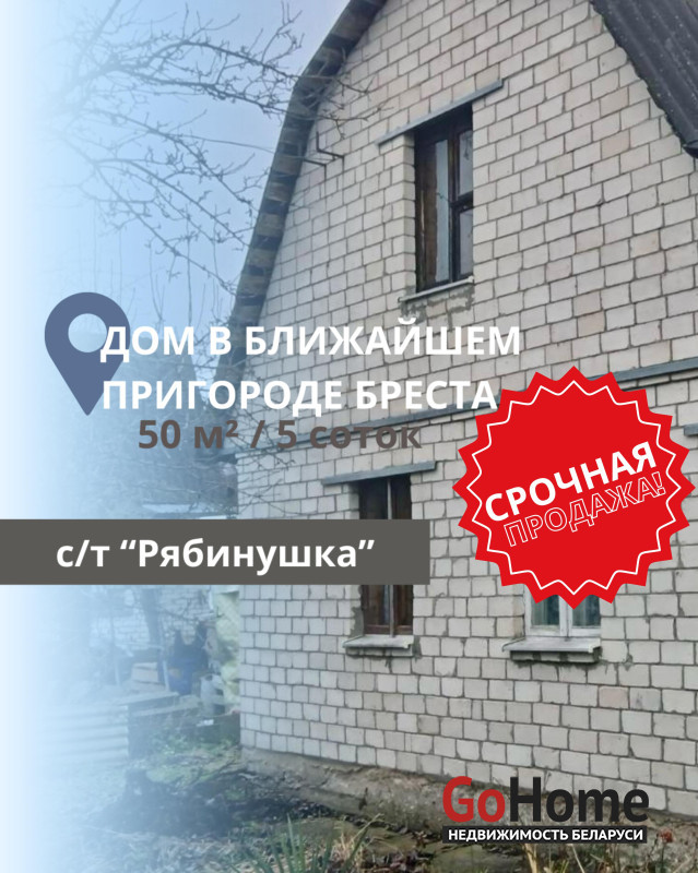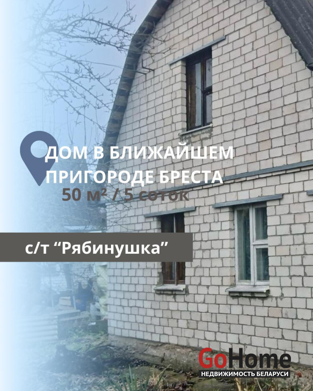 Подписывайтесь на наш instagram @ecrzby для удобного слежения за новыми актуальными объектами.Продаётся дом в СТ Рябинушка, Красный двор, Брестский район, ближайший пригород. Уютный 2-х этажный дачный домик с участком 5 соток расположен в ближайшем пригороде Бреста, до асфальта 400м, проезжает городской транспорт 45 автобус и 23 маршрутка. Общ. площадь дома 50,0 м. кв., состоит из гостевой комнаты с кухней на первом этаже и одной комнаты на втором этаже. Внутри дома стены оклеены обоями, на полу ламинат, окна деревянные. Отопление печное, электричество есть, скважина, газ по улице. На участке имеется большой сарай из блоков, беседка, установлена качель. Стены дома дерево/кирпич, забор бетонный, на участке выложена тратуарная плитка, установлена качель.