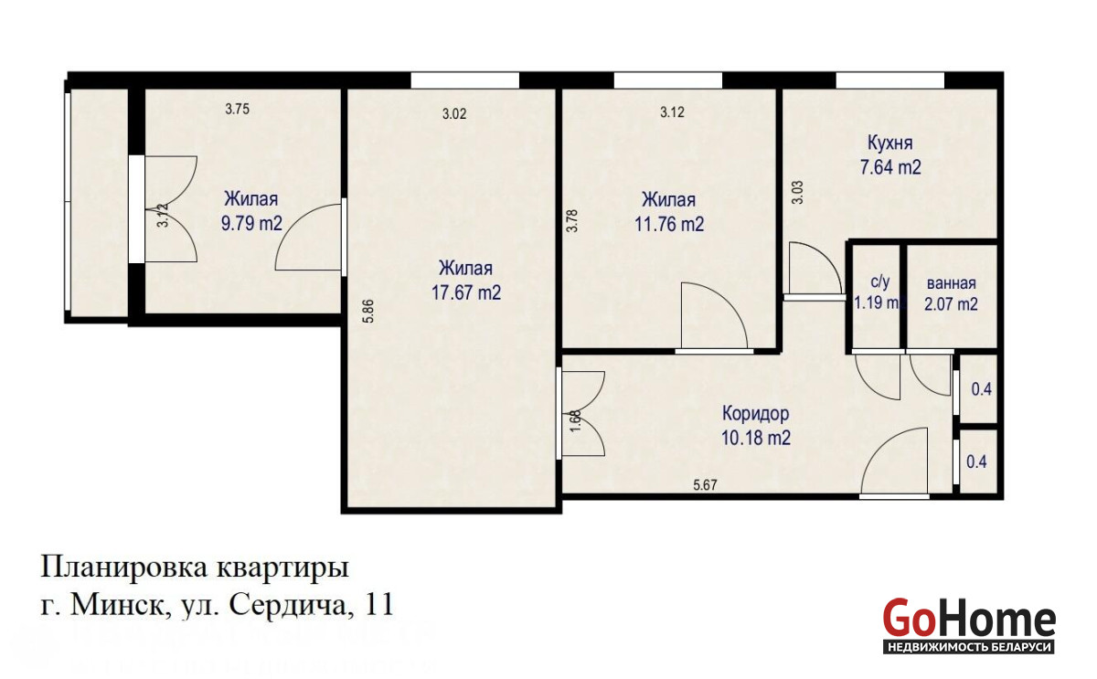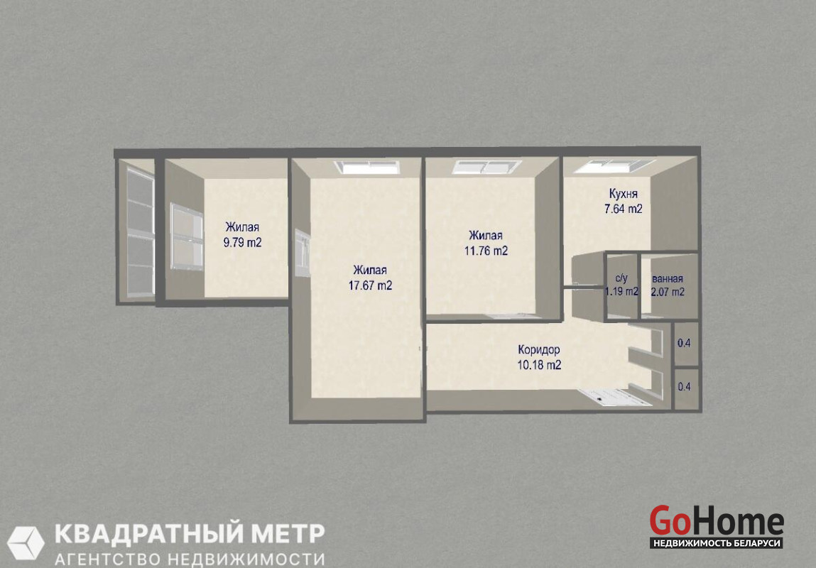 Квартира с прекрасным видом на дубовую рощу расположена на 7этаже, В квартире 3 полноценные комнаты 9,79мкв, 17,67мкв и 11,76 мкв, 2 комнаты - изолированные: кухня 7,64мкв, окна квартиры выходят на 1 сторону, санузел – раздельный.