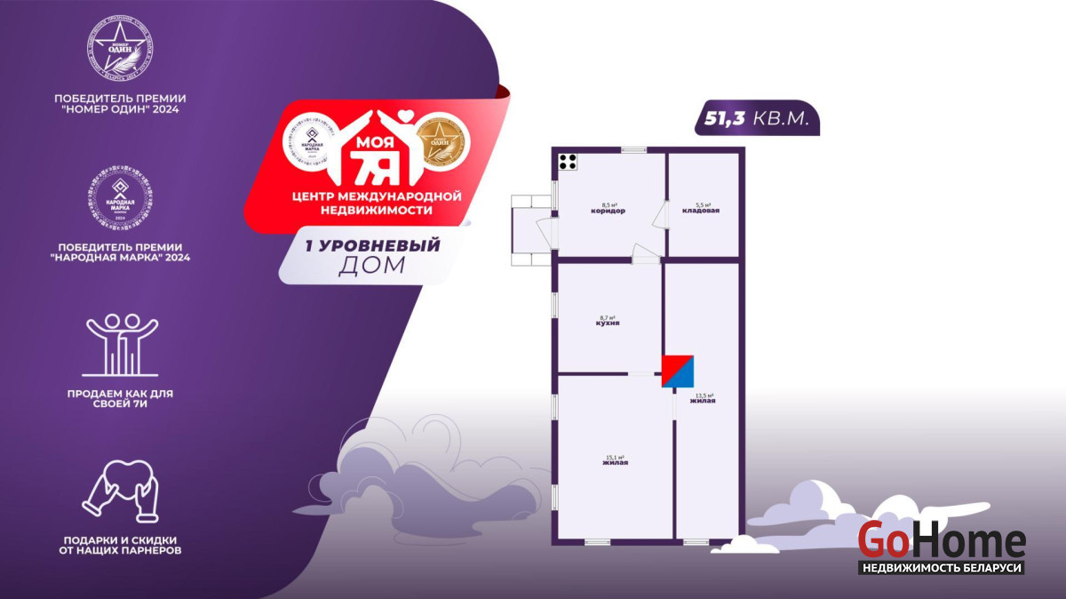 - Дом бревенчатый, одноуровневый, с общей площадью 51,3 кв.м. Рациональная планировка включает жилую площадь 28,6 кв.м. и кухню 8,7 кв.м. Пространство дома сохраняет тепло и простоту традиционного деревянного строения.