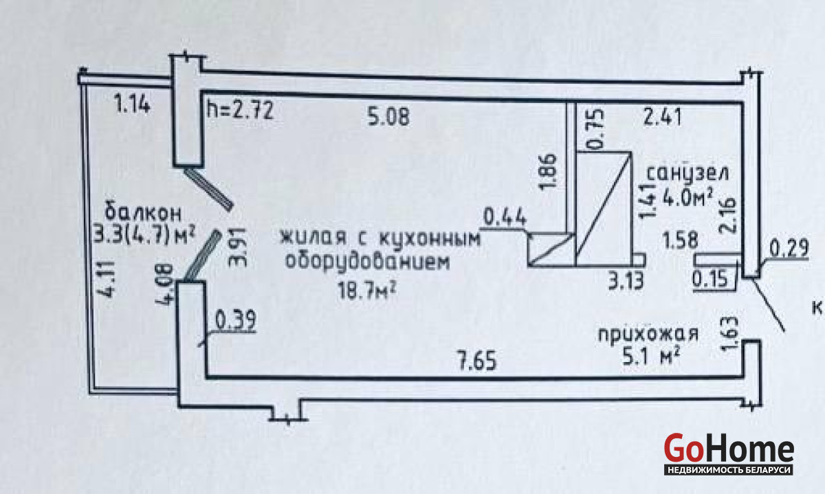 Комнат: 1 - жилая с кухонным оборудованием площадью 18,7 кв.м.