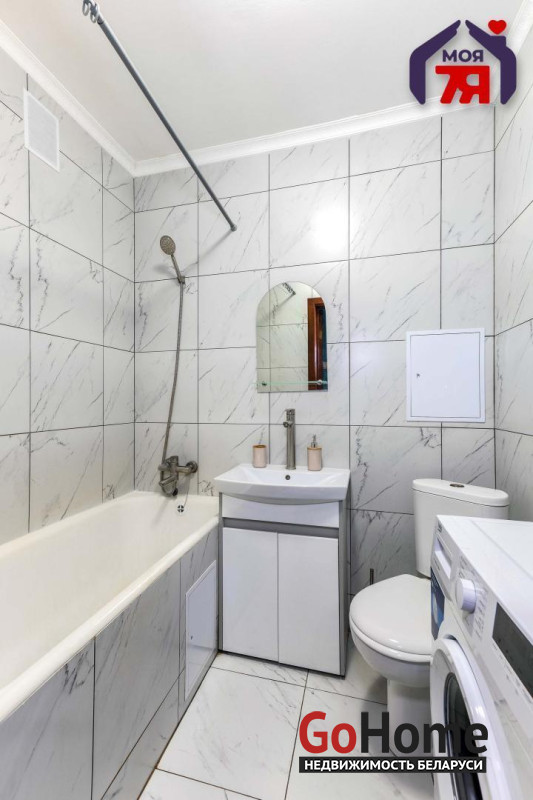 -Санузел совмещённый, облицован качественной плиткой. Здесь установлена новая сантехника и стиральная машина. Все лаконично и функционально.