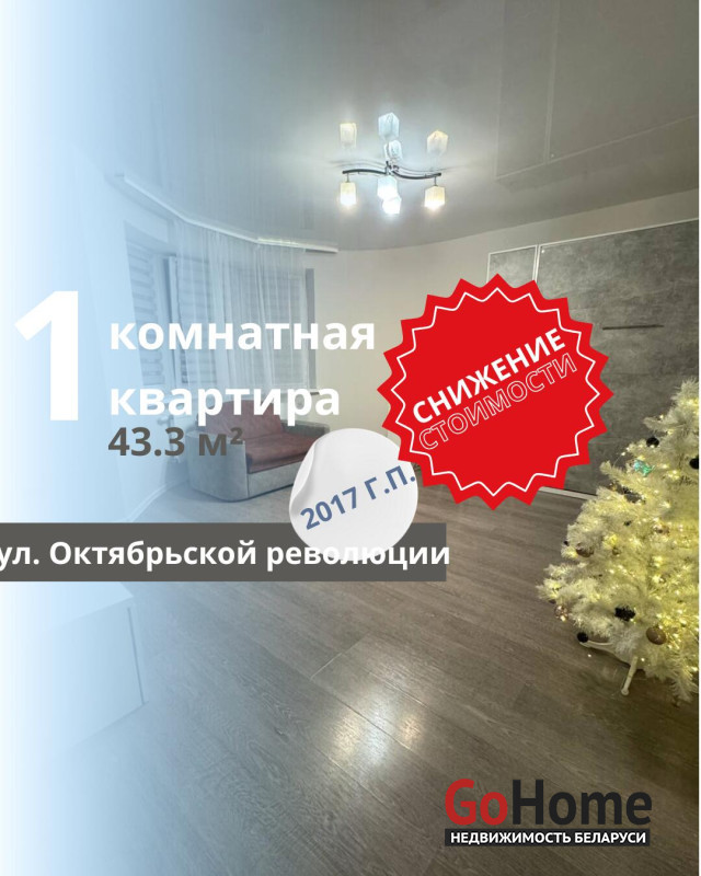 Подписывайтесь на наш instagram @ecrzby для удобного слежения за новыми актуальными объектами.Продаётся однокомнатная квартира на первом этаже 16-этажного монолитного дома, построенного в 2017 году, по адресу: ул. Октябрьская революция. Общая площадь квартиры составляет 43,3 кв. м, из которых жилая площадь — 18,2 кв. м, а кухня — 9,5 кв. м с выходом на лоджию. В отделке использованы качественные материалы: полы выполнены из ламината, потолок — натяжной, двери — экошпон. При продаже остаётся кухонный гарнитур с техникой, шкаф-купе и мебель в спальне. Квартира расположена в районе с развитой инфраструктурой, что делает её удобным местом для проживания.