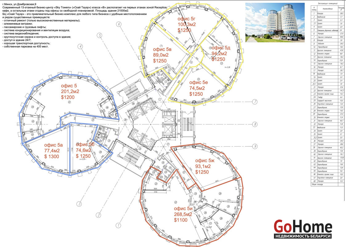 Предлагаем к продаже просторные офисные помещения площадью от 74.5м² до 268,5м2 на 3 этаже современного бизнес-центра «Sky Towers».