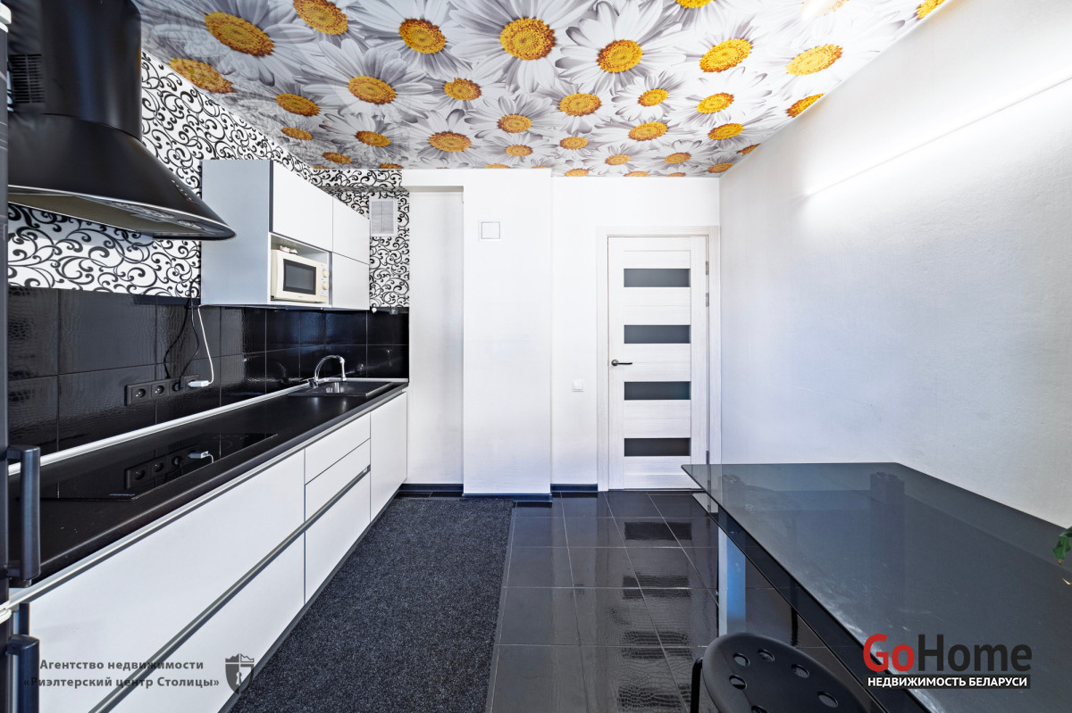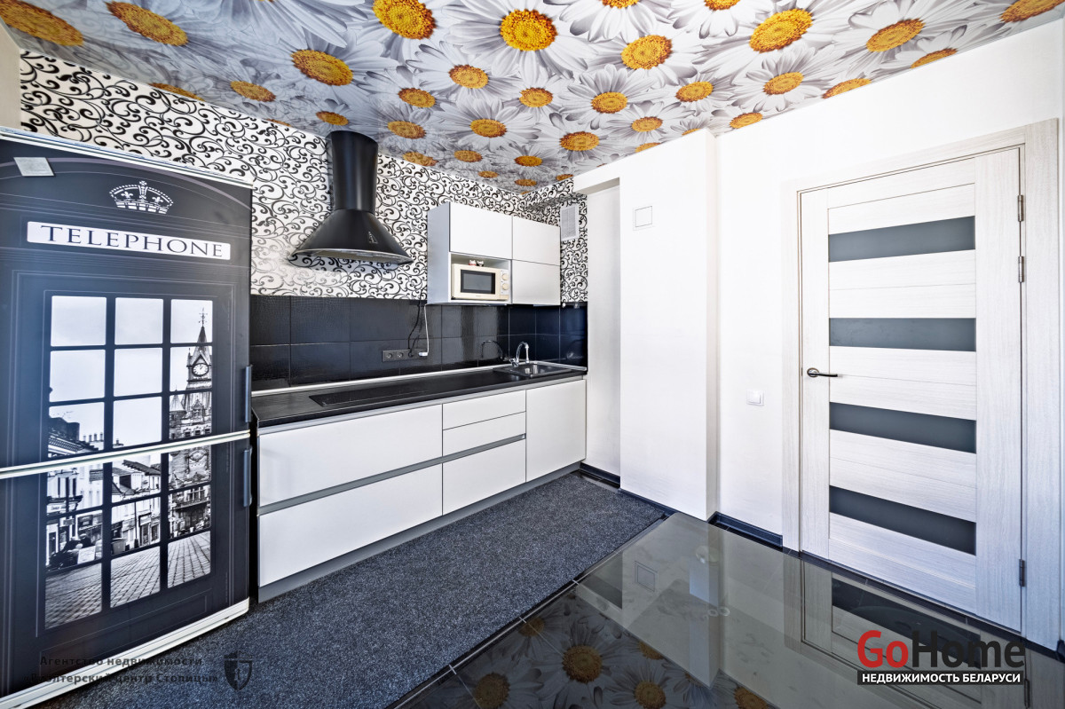 - на кухне дизайнерский глянцевый 3D потолок с прекрасными солнечными ромашками;