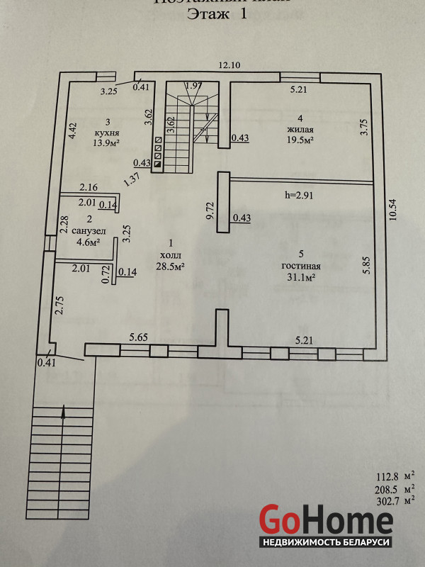 Общая площадь дома по СНБ – 302.7кв.м.; жилая площадь – 208.5кв.м.