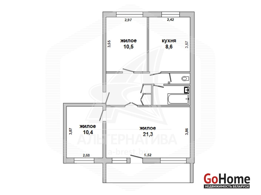 3-комнатная квартира, г. Кобрин, ул. Матросова, 1976 г.п., 2 / 3 кирпич, 62,9 / 42,2 / 8,6, санузел раздельный, лоджия, подвал, деревянные стеклопакеты, деревянные межкомнатные двери, входная дверь деревянная, потолки (2,50 м) - снежка, полы - линолеум и паркет, стены оклеены обоями, чугунная ванна, газовая колонка в кухне, новый электросчетчик, телефон. Квартира в жилом состоянии. Квартира расположена на две стороны. Чистый подъезд. Капитальный ремонт дома 2024 г. Заменены внутридомовые коммуникации. Произведен ремонт крыши. Во дворе парковка для автомобилей. Лот - 252155