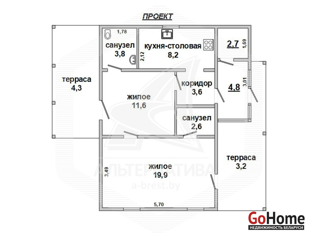 Агроусадьба в Каменецком р-не. 1941 г.п. 1 этаж. Общ.СНБ - 56,4 кв.м, общ.- 48,7 кв.м, жил.- 30,8 кв.м, кух.- 7,9 кв.м. 2 комнаты, высота потолка - 2,50 м - 2,70 м.