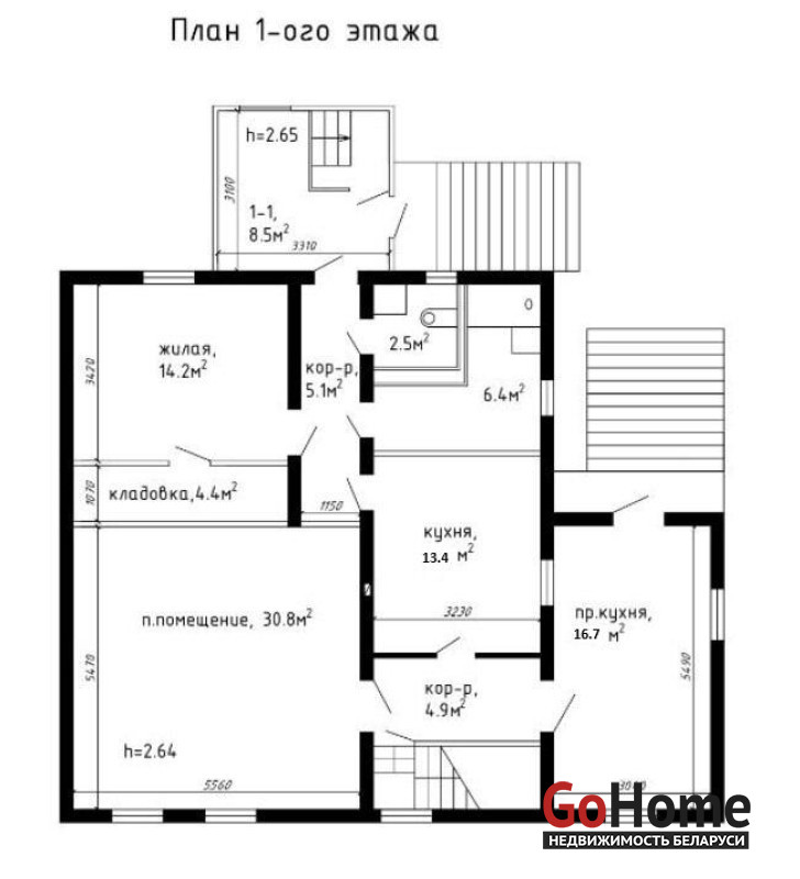 Жилой дом — 3 спальни, гардеробные, места хранения, два санузла (по одному на каждом жилом уровне), на первом этаже раздельный, большая гостиная на каждом жилом уровне.