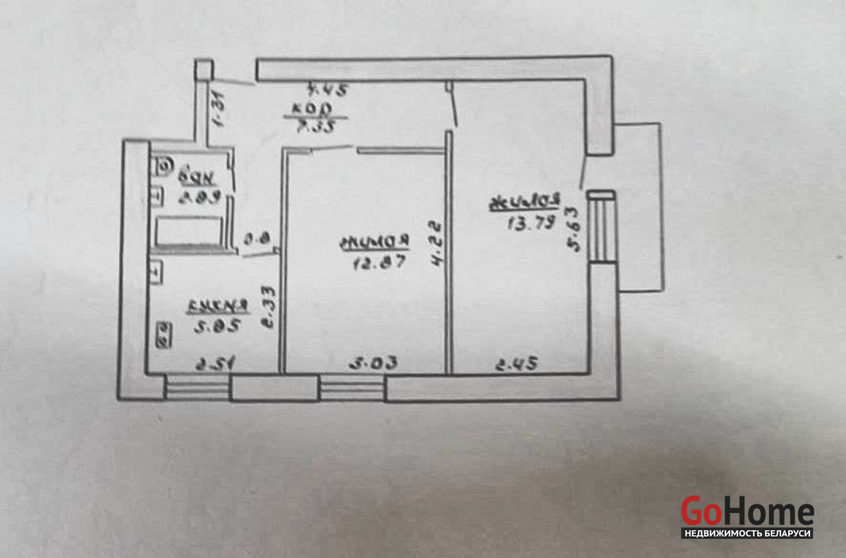 Общая площадь 42,74 м2/ жилая площадь 26,66 м2 (комнаты 12,87 м2 и 13,79 м2)/ кухня 5,05 м2.