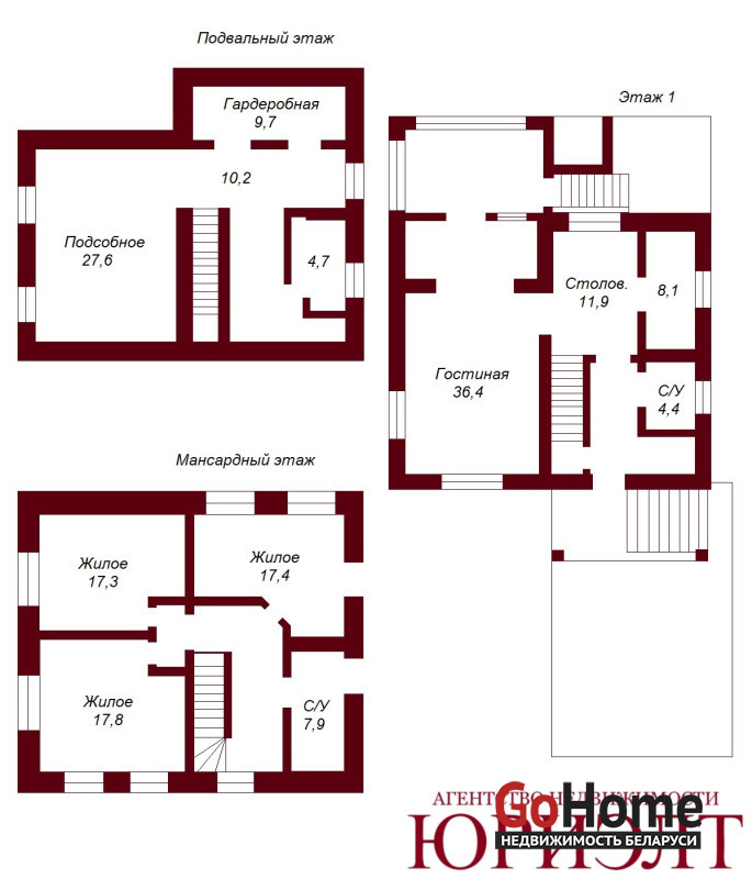 На первом этаже расположены: банный комплекс и хозблок. На втором этаже кабинет, санузел, кухня-гостиная с остекленной лоджией. Третий: 2 спальни, просторная ванная с выходом на балкон, гардеробная.