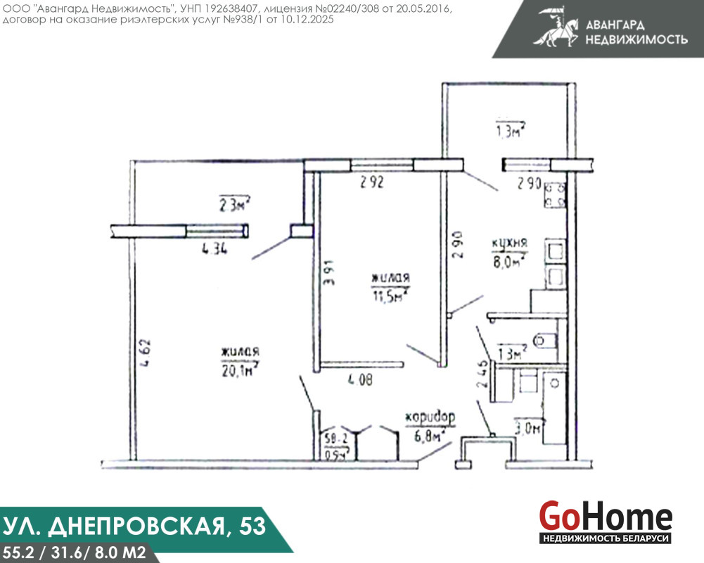 Площадь по СНБ 55,2 м2. Две раздельные комнаты площади 20,1 м2 с выходом лоджию площадью 4,4 м2 и комната площадью 11,5 м2. В коридоре площадью 6,8 м2 по проекту установлен шкаф, для хранение личных вещей. Просторная кухня площадью 8,0 м2. С выходом на балкон площадью 4,8 м2. Раздельный сан/узел, очень удобно при утренних сборах.