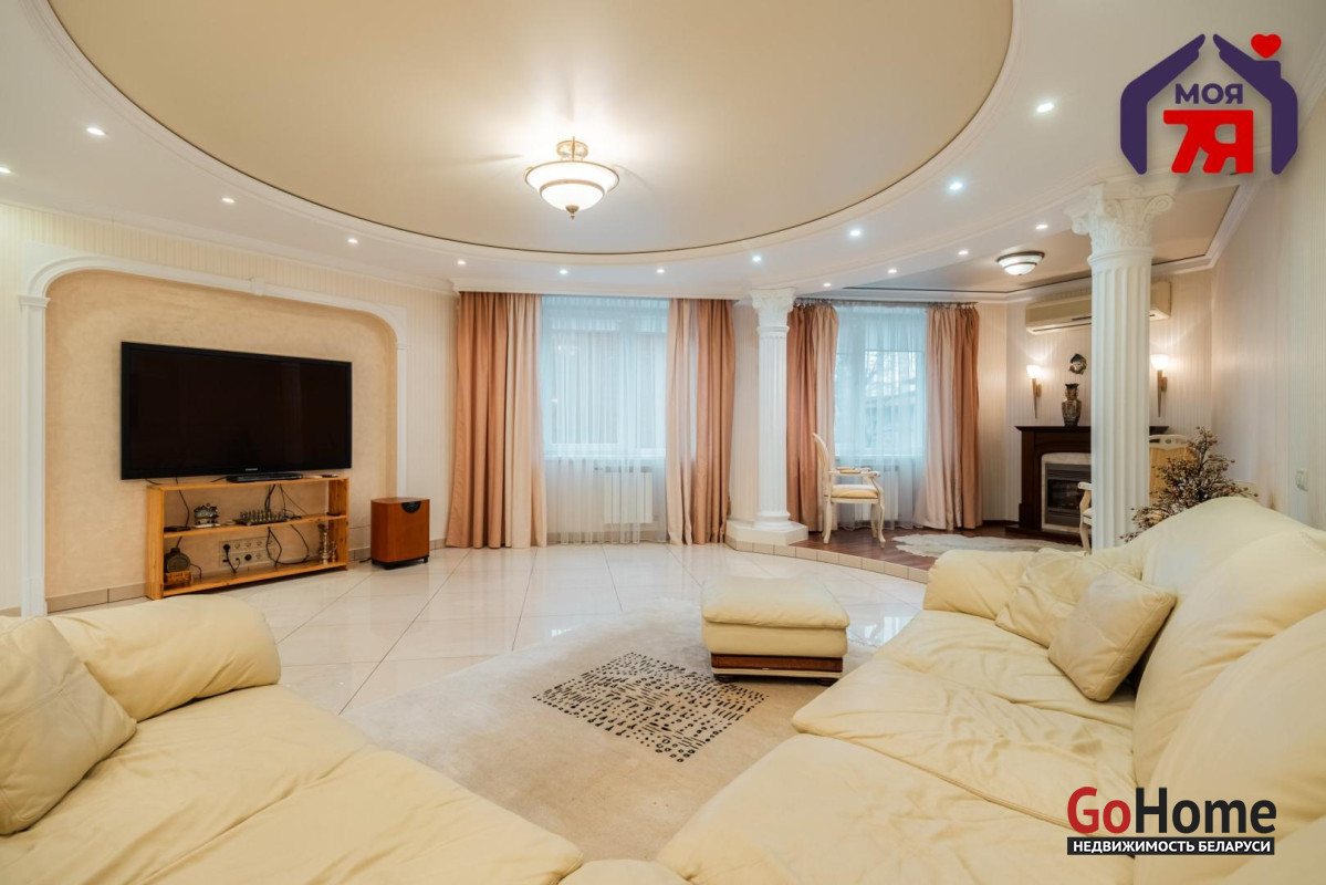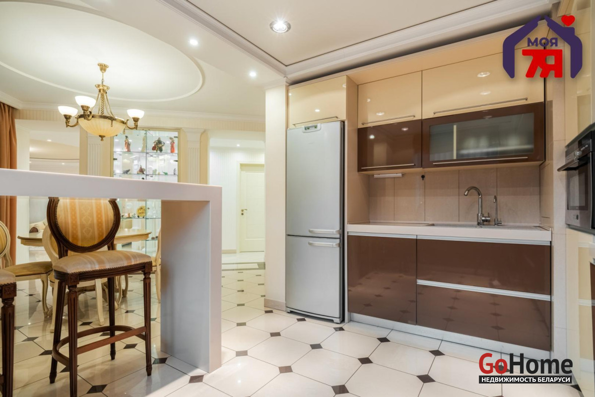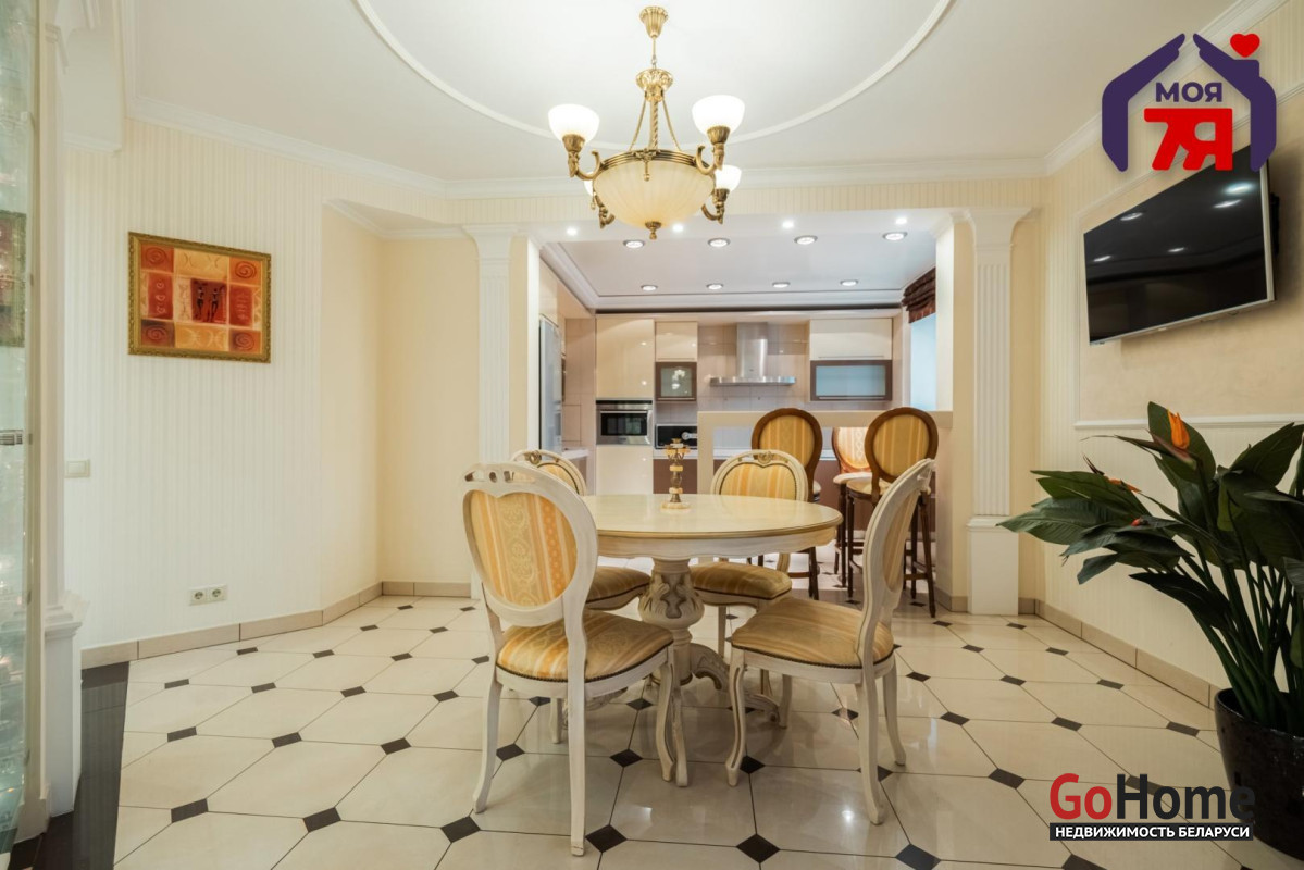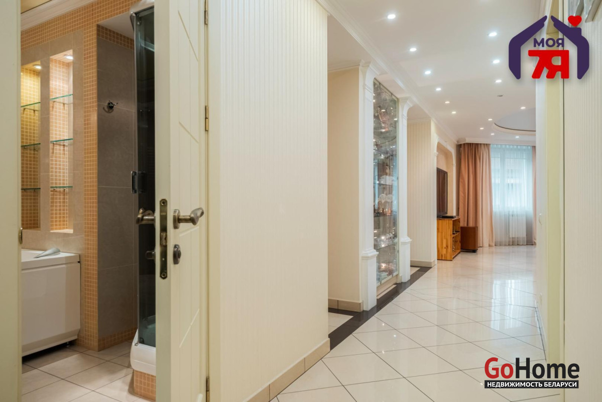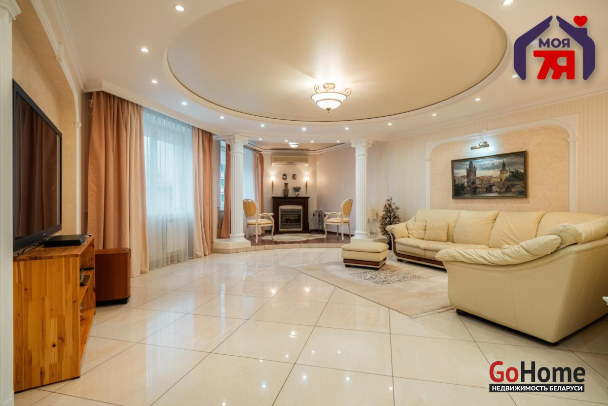 - Общая площадь по СНБ 126,8 кв.м при жилой 69,9 кв.м и кухне 25,9 кв.м. Высота потолков 2,7 м. Планировка помогает эффективно использовать пространство для разных повседневных задач.- В отделке квартиры использованы качественные материалы: на полу итальянская плитка с подогревом, в жилых комнатах ковролин. Вся квартира оборудована техникой известных брендов, что облегчает эксплуатацию и поддерживает высокий стандарт жилья.- Санузел совмещенного формата оснащён джакузи и душевой кабиной. Плиточная отделка и подсветка создают аккуратный визуальный облик. Установленное оборудование позволяет сразу пользоваться всем функционалом.- Кухня с вместительным гарнитуром и современной вытяжкой, барной зоной и подогревом пола, всё это повышает удобство ежедневного использования. Застекленная лоджия расширяет возможности пространства для отдыха и хранения.- Гостиная впечатляет простором и изысканным интерьером. Круглая потолочная композиция с подсветкой, колонны и декоративный камин подчёркивают архитектурную эстетику пространства. Большие окна наполняют комнату мягким светом, а удобная зона отдыха гармонично завершает интерьер.- Спальня включает кровать, прикроватные тумбы и большой шкаф. Кондиционер устанавливает комфортную температуру. Ковролин даёт мягкое покрытие по всей площади.- Кабинет с встроенной мебелью во всю стену и рабочим столом. Большое окно обеспечивает естественное освещение для продуктивной работы.- Коридор 20,5 кв.м со встроенными системами хранения. Освещение по всей длине удобно для перемещения и упорядочивания вещей.- Квартира расположена на 3 этаже 9-этажного каркасно-блочного дома 2004 года. Этаж удобен для подъёма и обеспечивает приятный вид.- Территория дома ограждена, что повышает приватность и безопасность. Просторная парковка и собственное место внутри территории экономят время ежедневно. Наличие консьержа и современной детской площадки подчеркивают статус проживания.- Развитая инфраструктура вокруг дома позволяет решать все бытовые вопросы рядом: ТЦ Европа и ТЦ Рига, аптеки, банки, кафе, детский сад, гимназия, средняя школа, кинотеатр Октябрь. Ботанический сад и Парк Челюскинцев дают возможность проводить время на природе.- В пяти минутах ходьбы находится станция метро Академия Наук. Удобные подъездные пути и транспортное сообщение помогают быстро добираться в любую точку города.