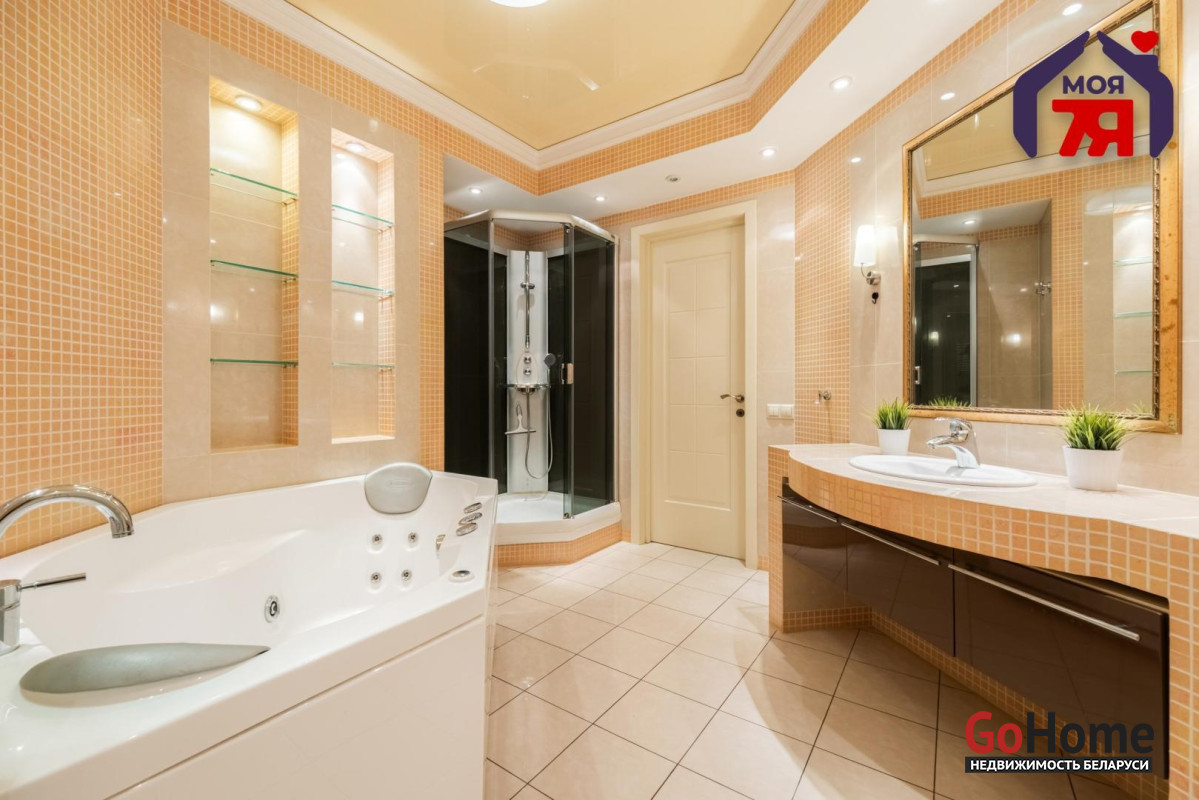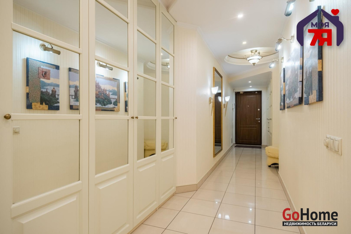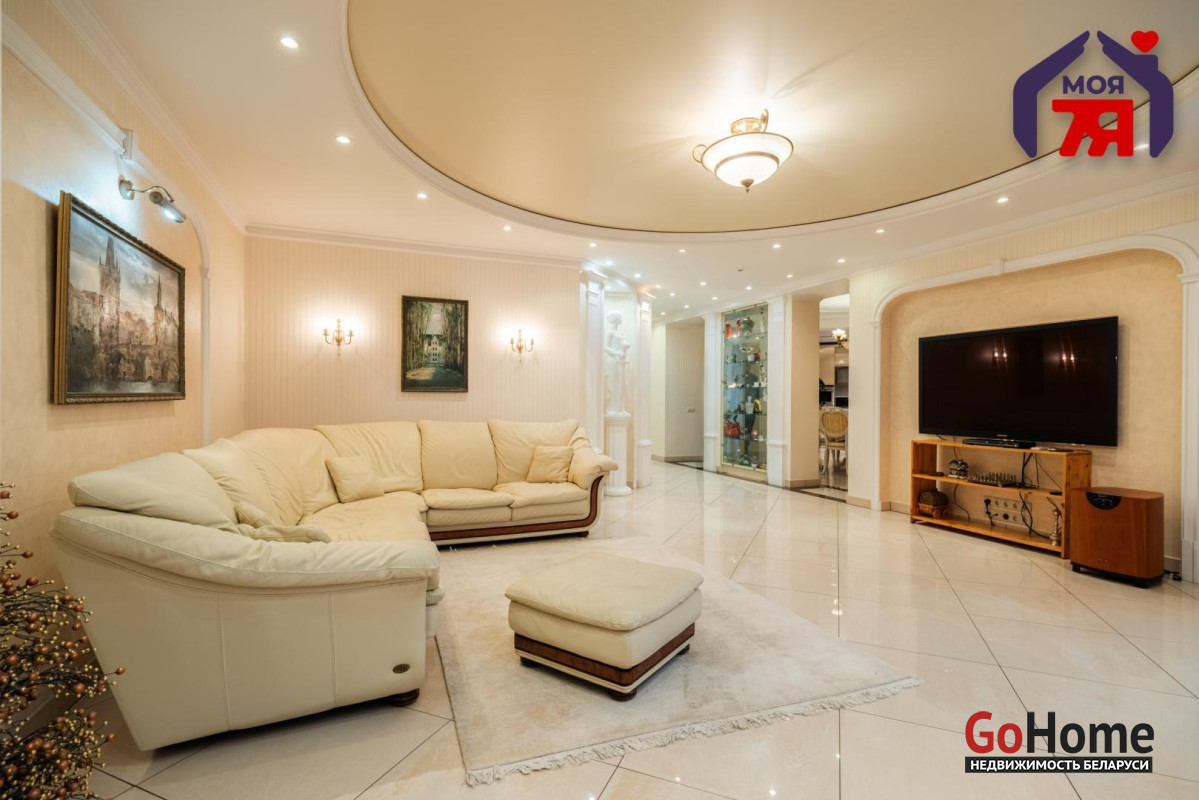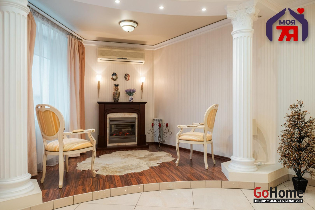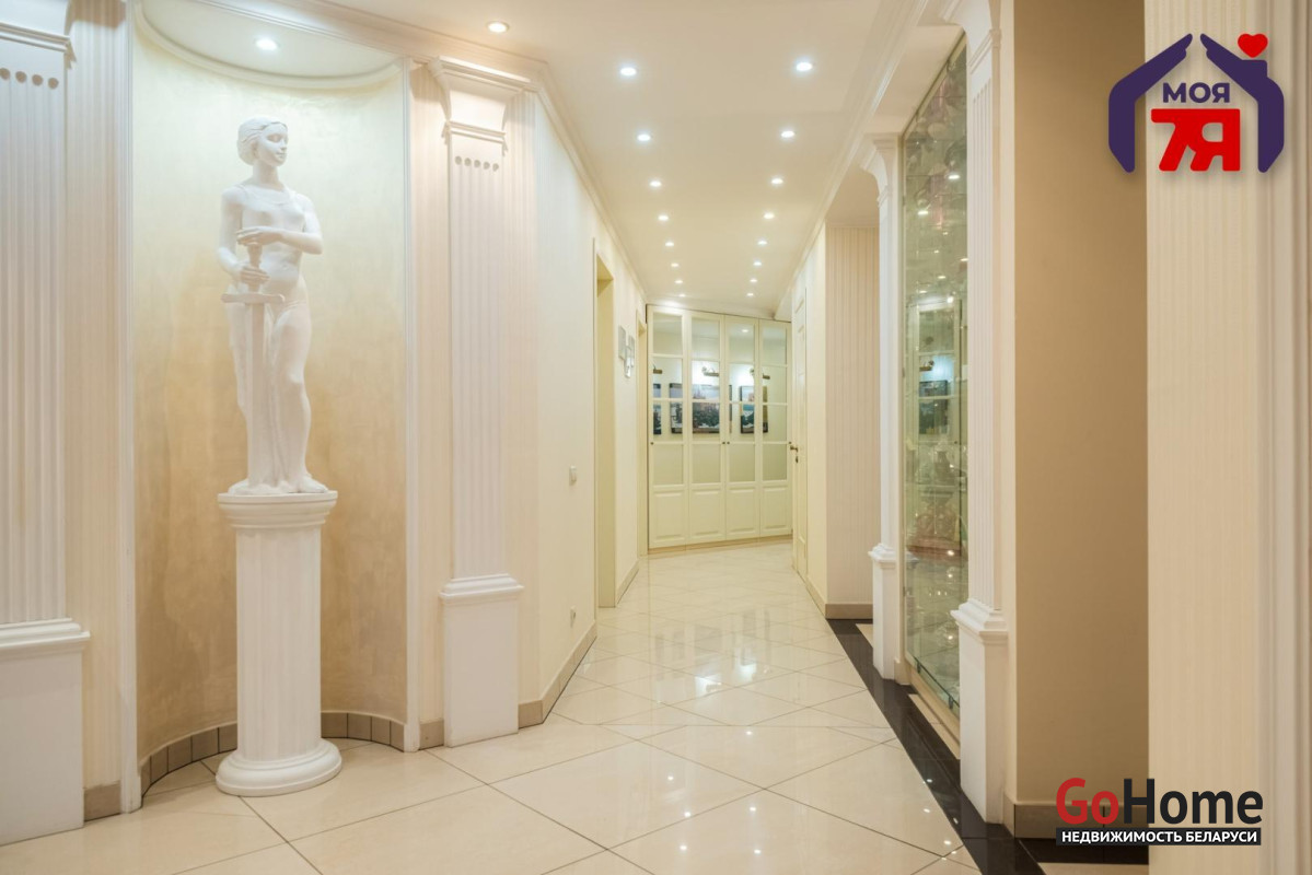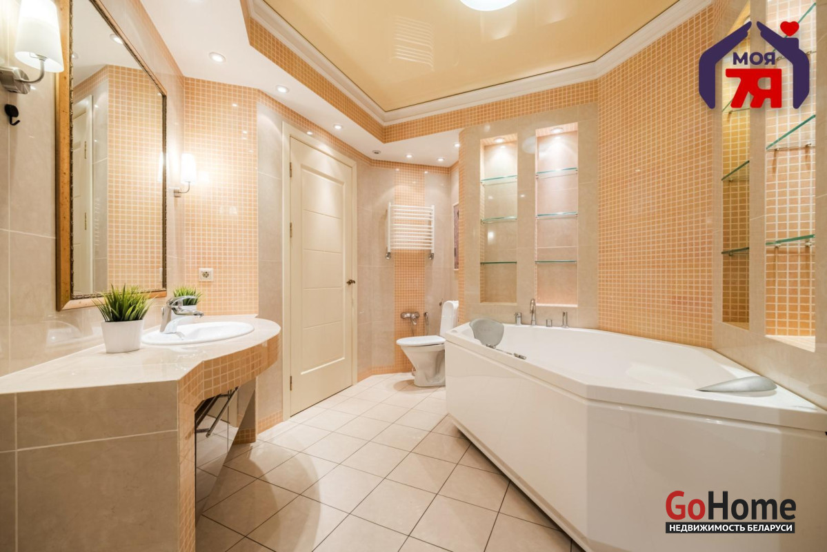 - Общая площадь по СНБ 126,8 кв.м при жилой 69,9 кв.м и кухне 25,9 кв.м. Высота потолков 2,7 м. Планировка помогает эффективно использовать пространство для разных повседневных задач.- В отделке квартиры использованы качественные материалы: на полу итальянская плитка с подогревом, в жилых комнатах ковролин. Вся квартира оборудована техникой известных брендов, что облегчает эксплуатацию и поддерживает высокий стандарт жилья.- Санузел совмещенного формата оснащён джакузи и душевой кабиной. Плиточная отделка и подсветка создают аккуратный визуальный облик. Установленное оборудование позволяет сразу пользоваться всем функционалом.- Кухня с вместительным гарнитуром и современной вытяжкой, барной зоной и подогревом пола, всё это повышает удобство ежедневного использования. Застекленная лоджия расширяет возможности пространства для отдыха и хранения.- Гостиная впечатляет простором и изысканным интерьером. Круглая потолочная композиция с подсветкой, колонны и декоративный камин подчёркивают архитектурную эстетику пространства. Большие окна наполняют комнату мягким светом, а удобная зона отдыха гармонично завершает интерьер.- Спальня включает кровать, прикроватные тумбы и большой шкаф. Кондиционер устанавливает комфортную температуру. Ковролин даёт мягкое покрытие по всей площади.- Кабинет с встроенной мебелью во всю стену и рабочим столом. Большое окно обеспечивает естественное освещение для продуктивной работы.- Коридор 20,5 кв.м со встроенными системами хранения. Освещение по всей длине удобно для перемещения и упорядочивания вещей.- Квартира расположена на 3 этаже 9-этажного каркасно-блочного дома 2004 года. Этаж удобен для подъёма и обеспечивает приятный вид.- Территория дома ограждена, что повышает приватность и безопасность. Просторная парковка и собственное место внутри территории экономят время ежедневно. Наличие консьержа и современной детской площадки подчеркивают статус проживания.- Развитая инфраструктура вокруг дома позволяет решать все бытовые вопросы рядом: ТЦ Европа и ТЦ Рига, аптеки, банки, кафе, детский сад, гимназия, средняя школа, кинотеатр Октябрь. Ботанический сад и Парк Челюскинцев дают возможность проводить время на природе.- В пяти минутах ходьбы находится станция метро Академия Наук. Удобные подъездные пути и транспортное сообщение помогают быстро добираться в любую точку города.