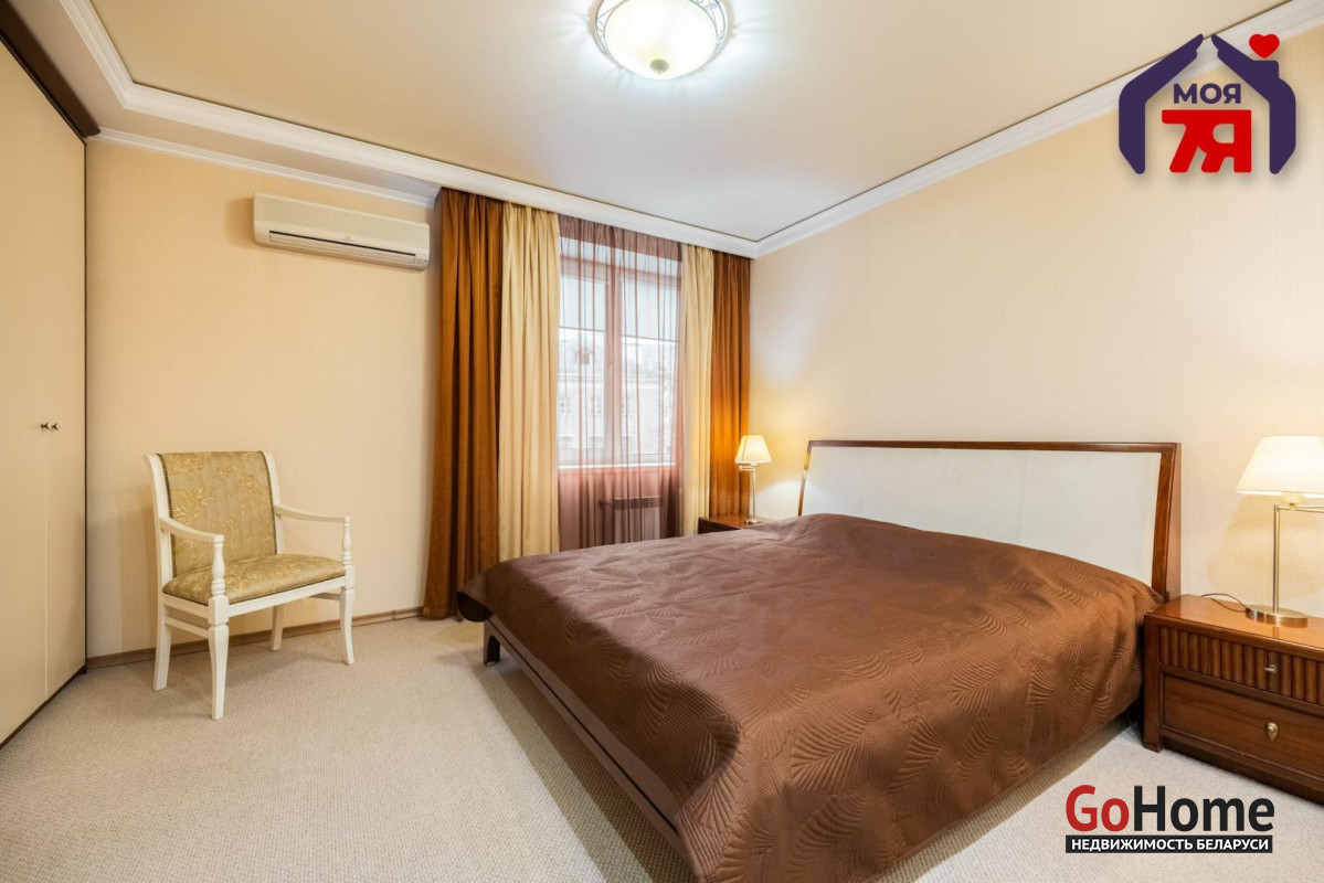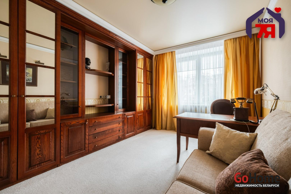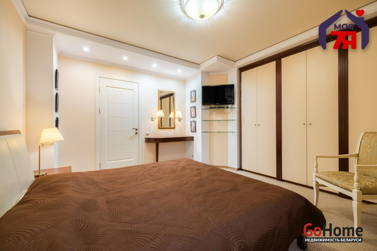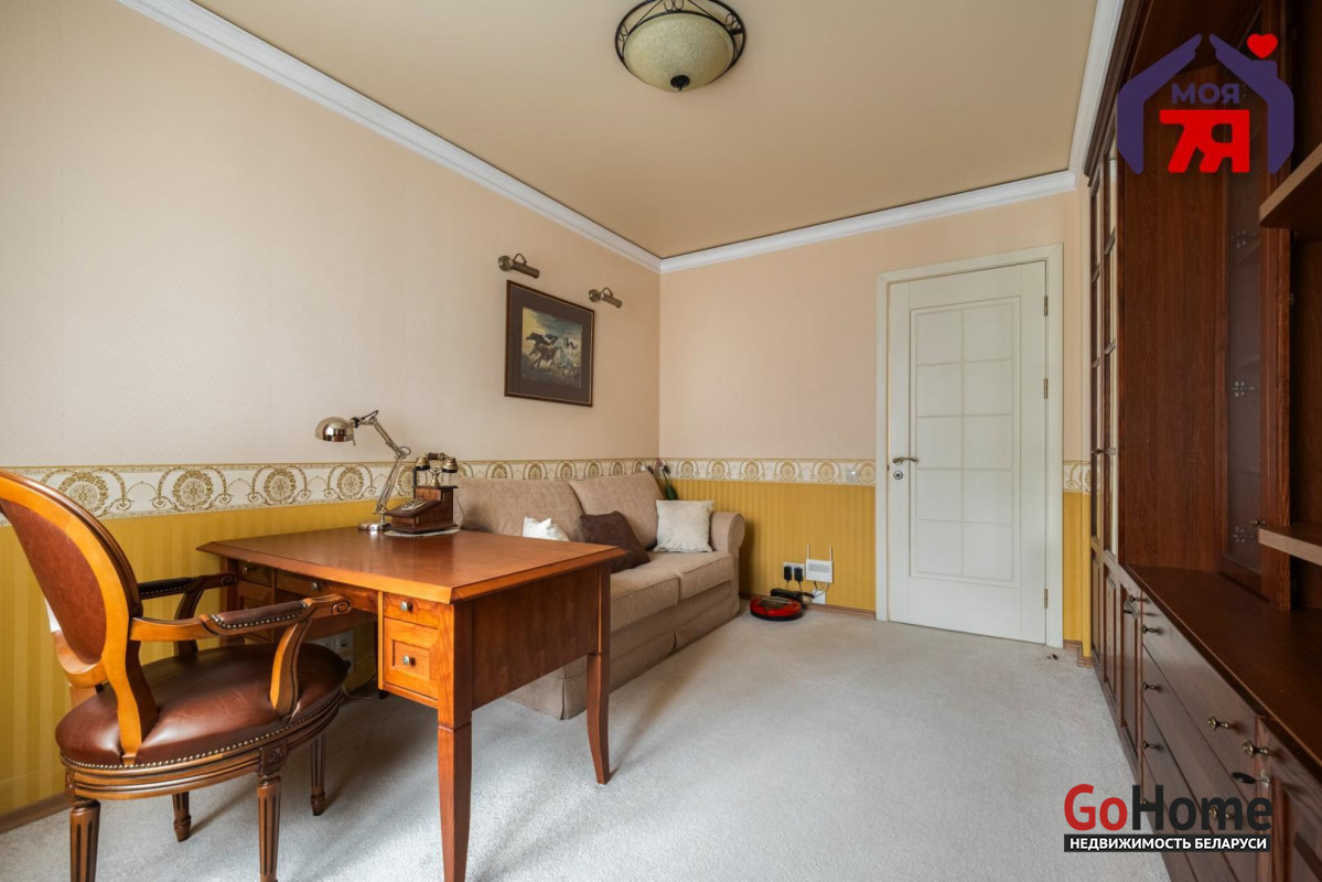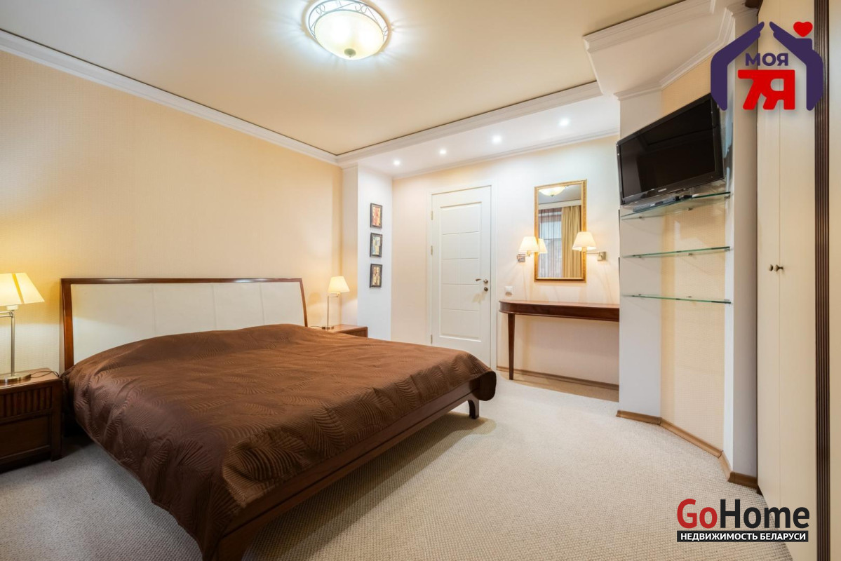 - Общая площадь по СНБ 126,8 кв.м при жилой 69,9 кв.м и кухне 25,9 кв.м. Высота потолков 2,7 м. Планировка помогает эффективно использовать пространство для разных повседневных задач.- В отделке квартиры использованы качественные материалы: на полу итальянская плитка с подогревом, в жилых комнатах ковролин. Вся квартира оборудована техникой известных брендов, что облегчает эксплуатацию и поддерживает высокий стандарт жилья.- Санузел совмещенного формата оснащён джакузи и душевой кабиной. Плиточная отделка и подсветка создают аккуратный визуальный облик. Установленное оборудование позволяет сразу пользоваться всем функционалом.- Кухня с вместительным гарнитуром и современной вытяжкой, барной зоной и подогревом пола, всё это повышает удобство ежедневного использования. Застекленная лоджия расширяет возможности пространства для отдыха и хранения.- Гостиная впечатляет простором и изысканным интерьером. Круглая потолочная композиция с подсветкой, колонны и декоративный камин подчёркивают архитектурную эстетику пространства. Большие окна наполняют комнату мягким светом, а удобная зона отдыха гармонично завершает интерьер.- Спальня включает кровать, прикроватные тумбы и большой шкаф. Кондиционер устанавливает комфортную температуру. Ковролин даёт мягкое покрытие по всей площади.- Кабинет с встроенной мебелью во всю стену и рабочим столом. Большое окно обеспечивает естественное освещение для продуктивной работы.- Коридор 20,5 кв.м со встроенными системами хранения. Освещение по всей длине удобно для перемещения и упорядочивания вещей.- Квартира расположена на 3 этаже 9-этажного каркасно-блочного дома 2004 года. Этаж удобен для подъёма и обеспечивает приятный вид.- Территория дома ограждена, что повышает приватность и безопасность. Просторная парковка и собственное место внутри территории экономят время ежедневно. Наличие консьержа и современной детской площадки подчеркивают статус проживания.- Развитая инфраструктура вокруг дома позволяет решать все бытовые вопросы рядом: ТЦ Европа и ТЦ Рига, аптеки, банки, кафе, детский сад, гимназия, средняя школа, кинотеатр Октябрь. Ботанический сад и Парк Челюскинцев дают возможность проводить время на природе.- В пяти минутах ходьбы находится станция метро Академия Наук. Удобные подъездные пути и транспортное сообщение помогают быстро добираться в любую точку города.