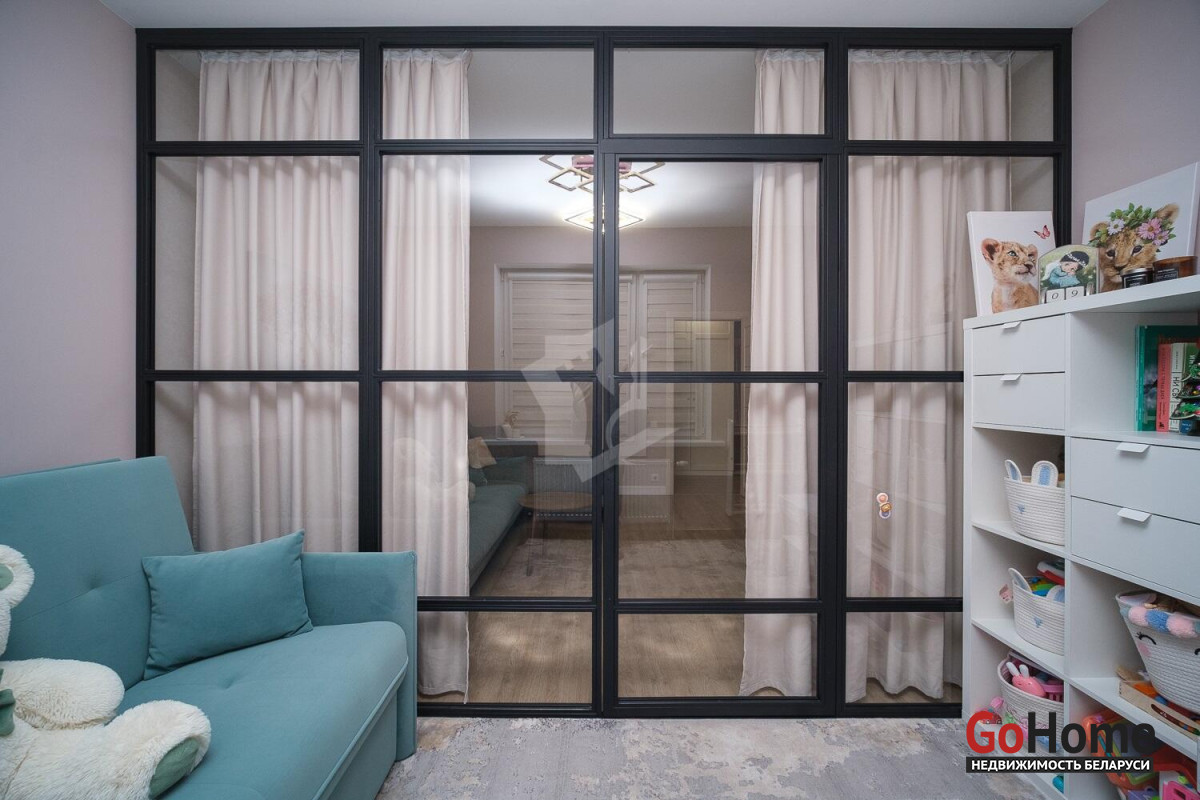 Продуманное зонирование пространства, стеклянная перегородка с эффектом звукоизоляции.